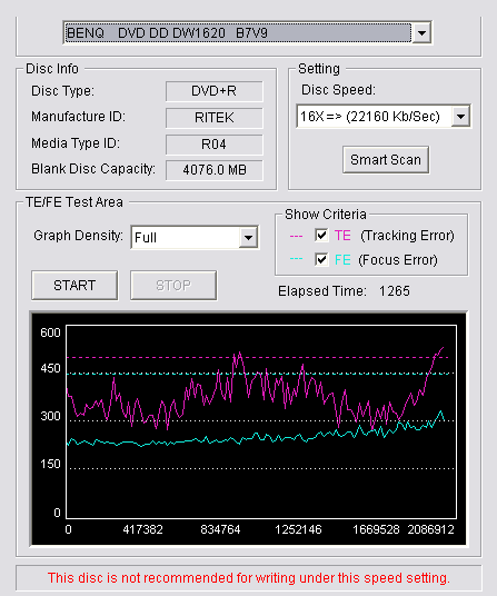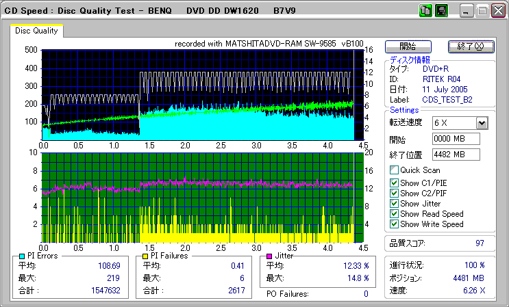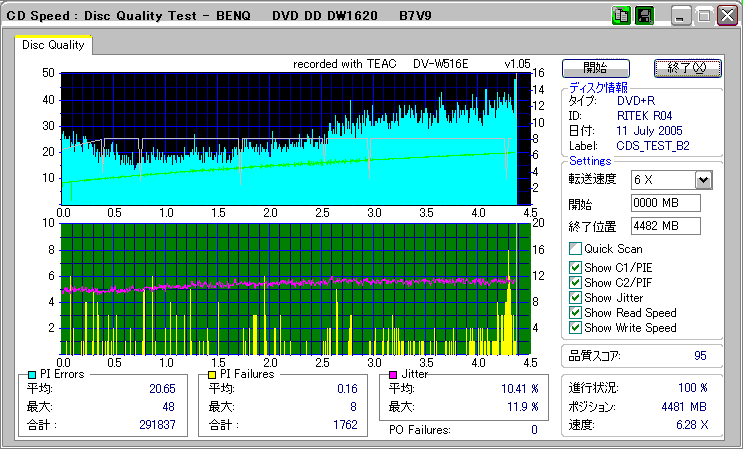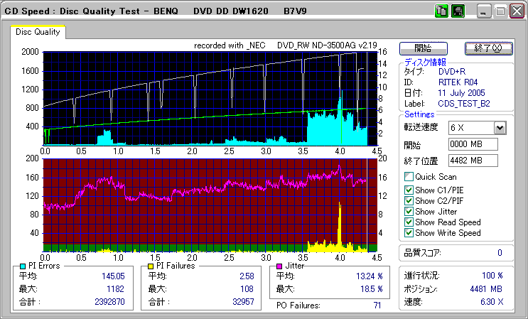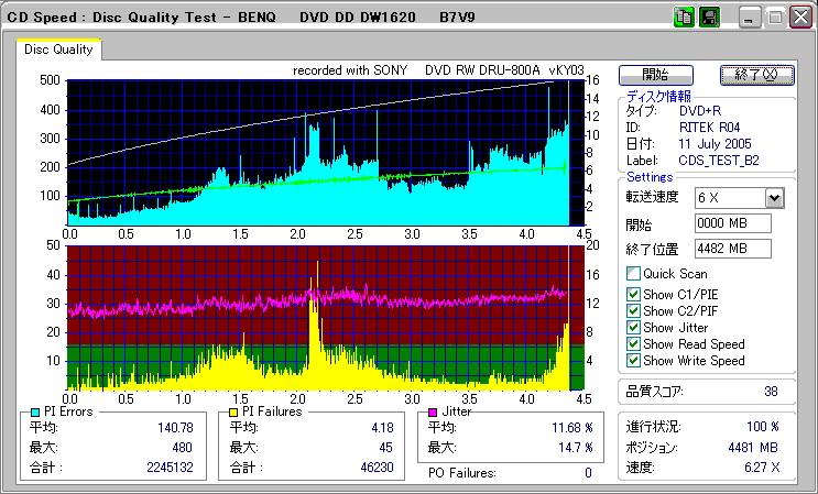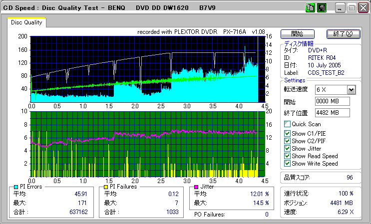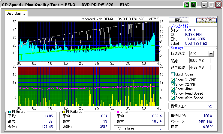 CDSpeed + BenQ DW1620Rの品質テスト(6x CAV PIE/PIF/Jitter/POF)