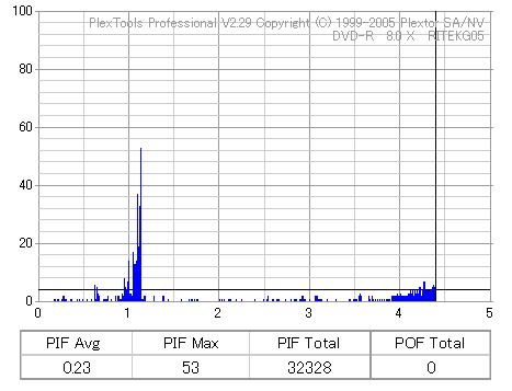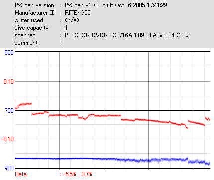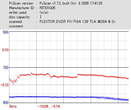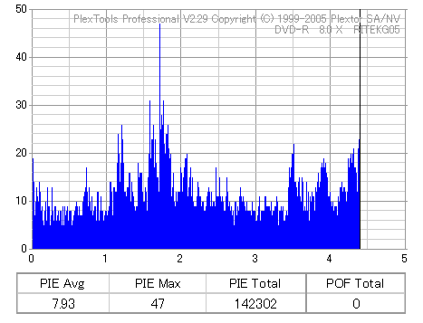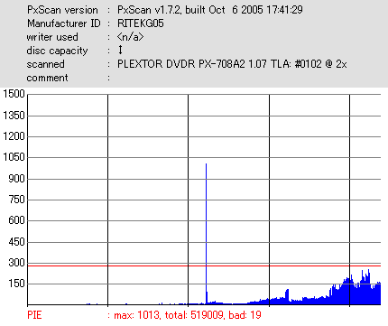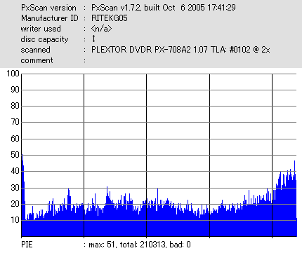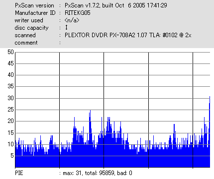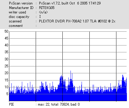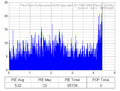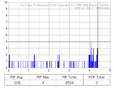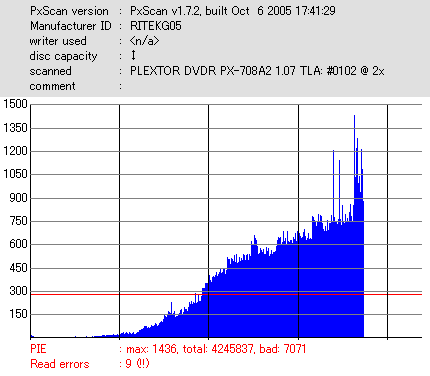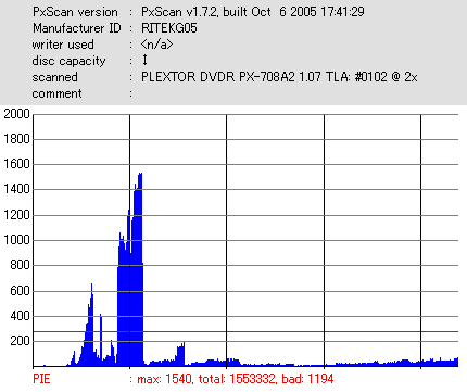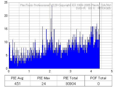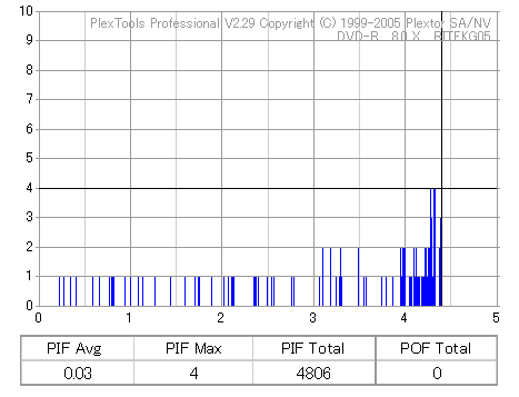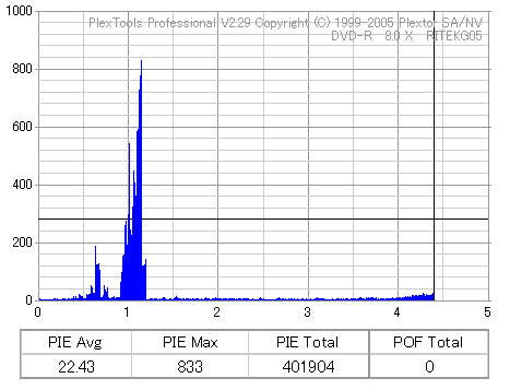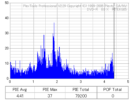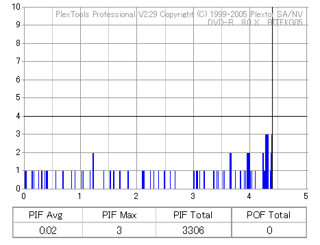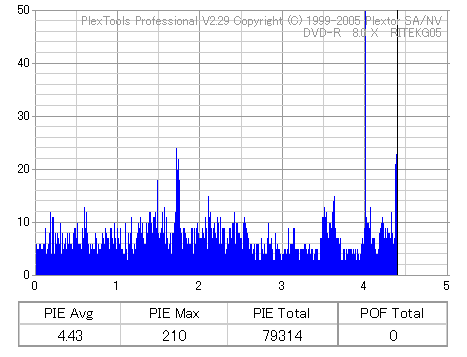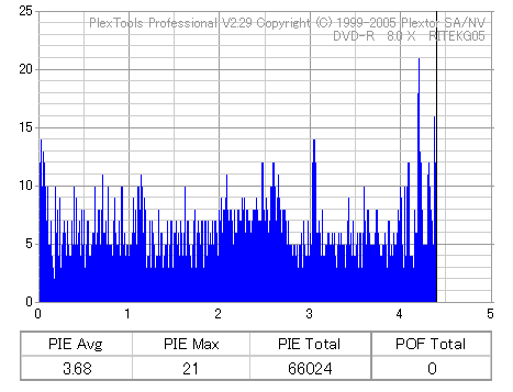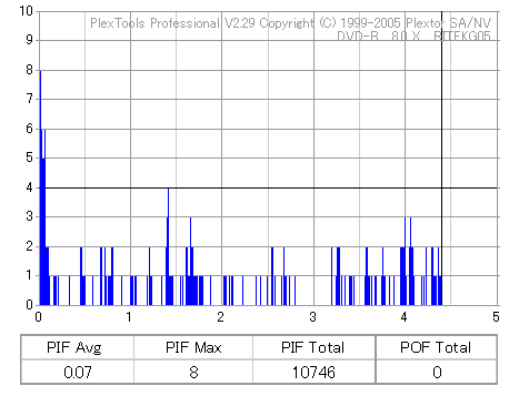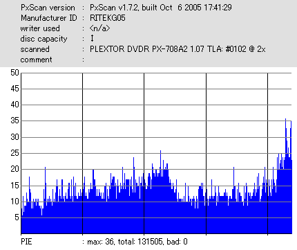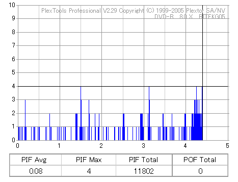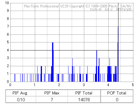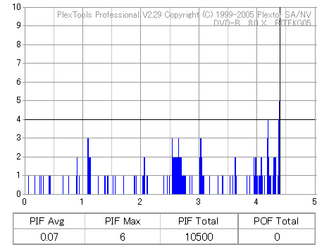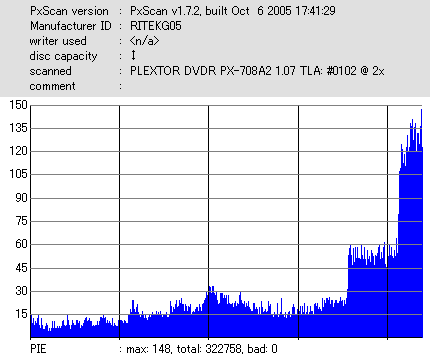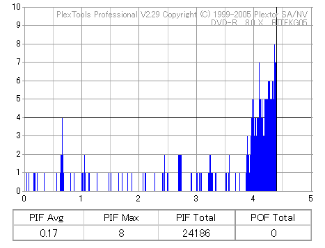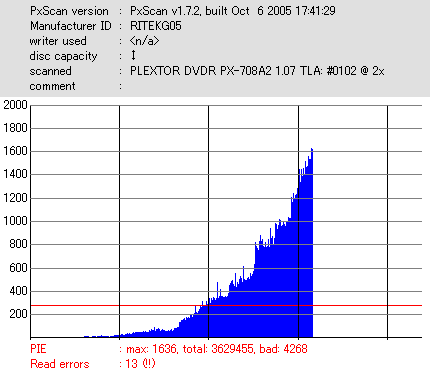 例のMasterDisc盤のあまりの酷さに、急に純正を計測したくなってしまったのが掲載の動機。 なんか全体的に外周にPIFが集まってる感じで、しかもドライブとの相性もありそうな感じではありますが、 焼いた直後はそこそこには良い感じなのが最近のRiTEK。これからゆったり劣化していくんでしょう。 |