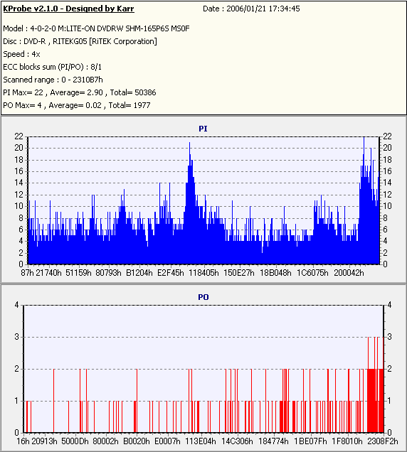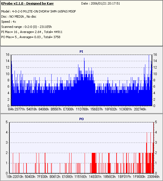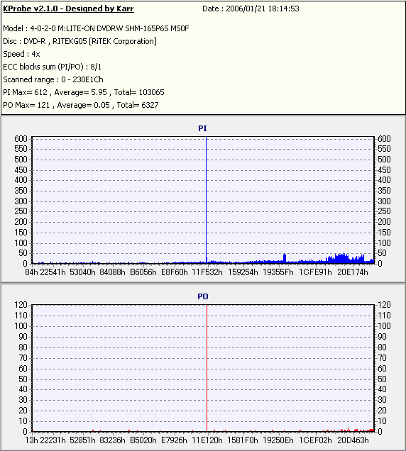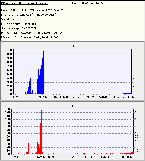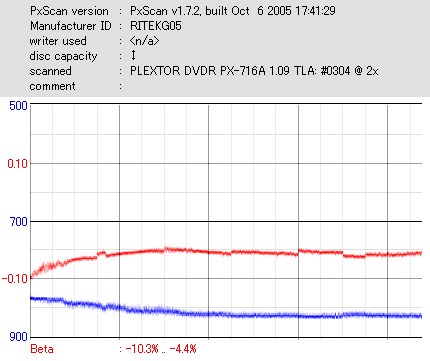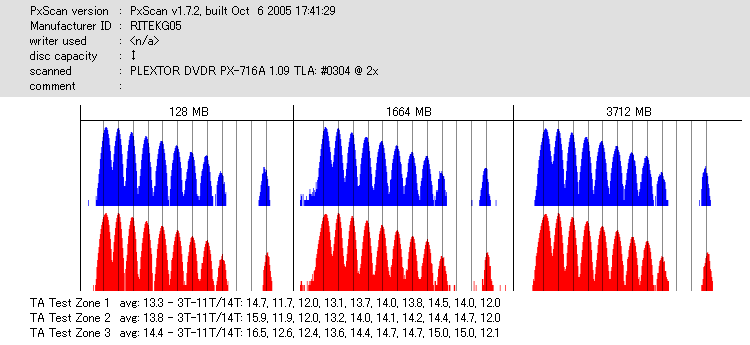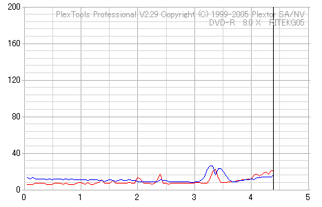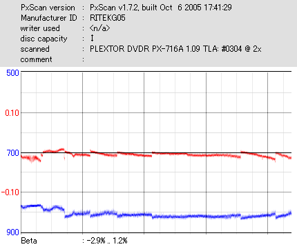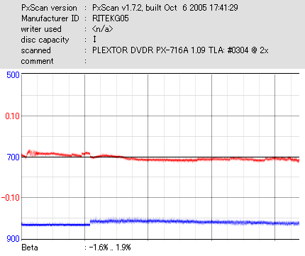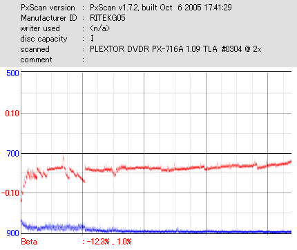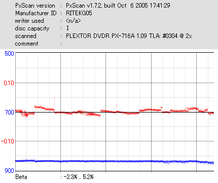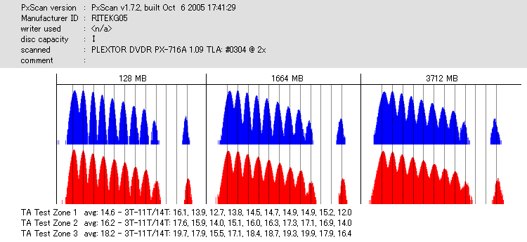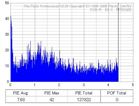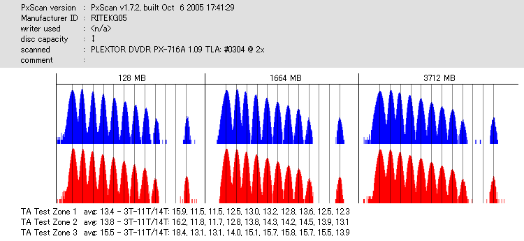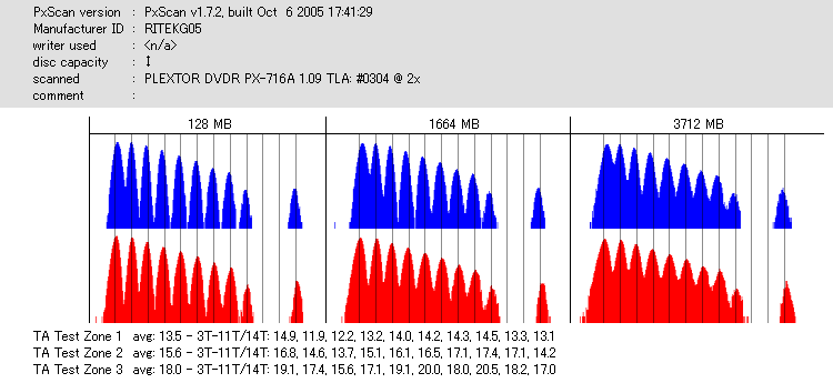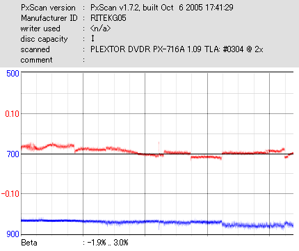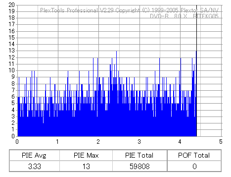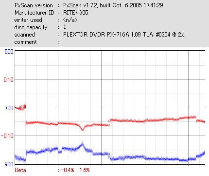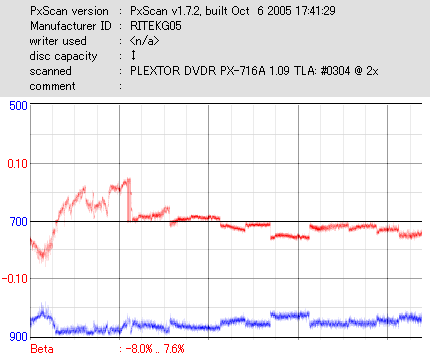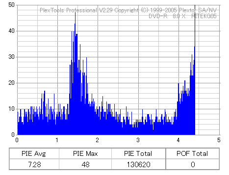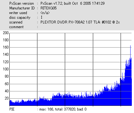 例のMasterDisc盤のあまりの酷さに、急に純正を計測したくなってしまったのが掲載の動機。 なんか全体的に外周にPIFが集まってる感じで、しかもドライブとの相性もありそうな感じではありますが、 焼いた直後はそこそこには良い感じなのが最近のRiTEK。これからゆったり劣化していくんでしょう。 |