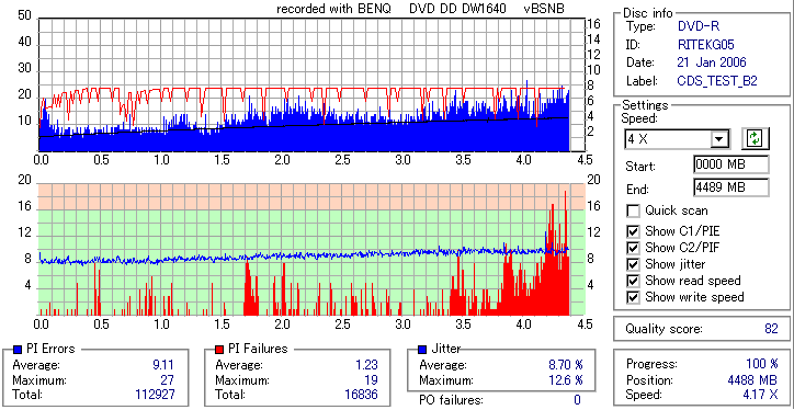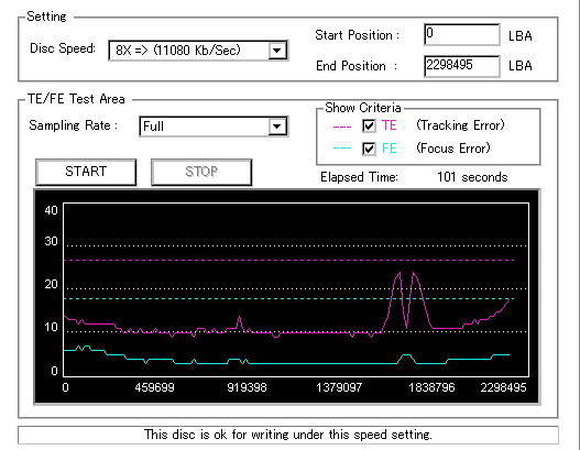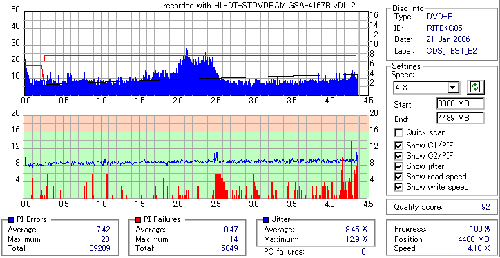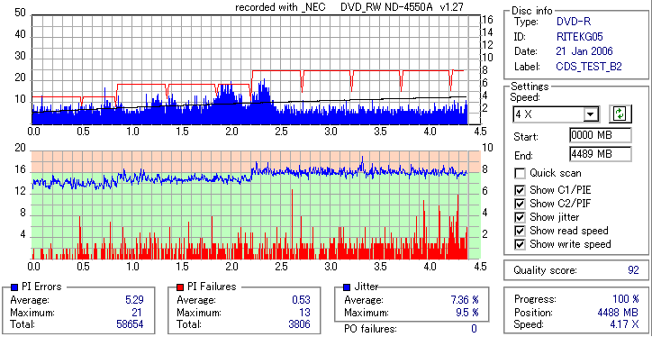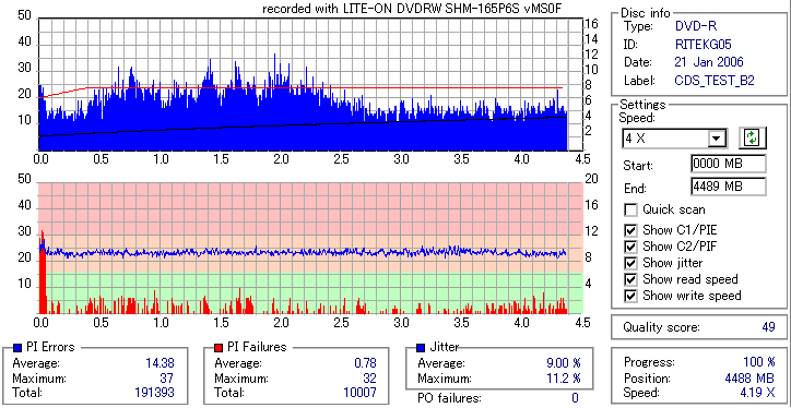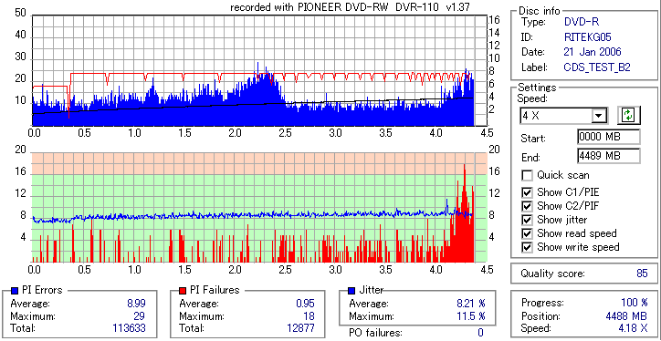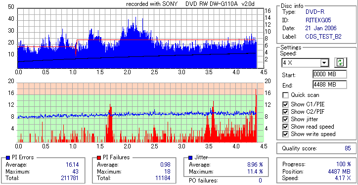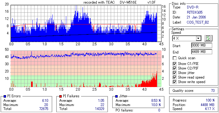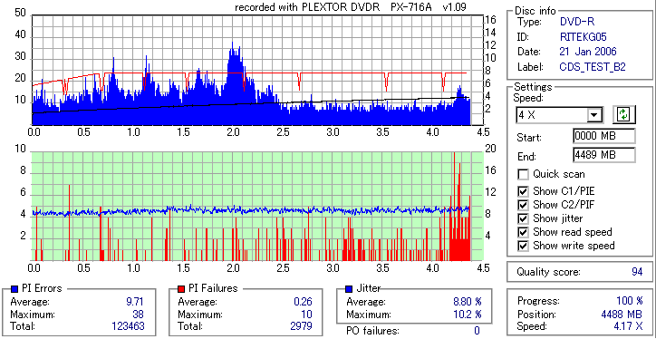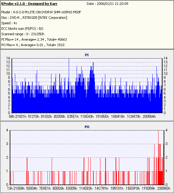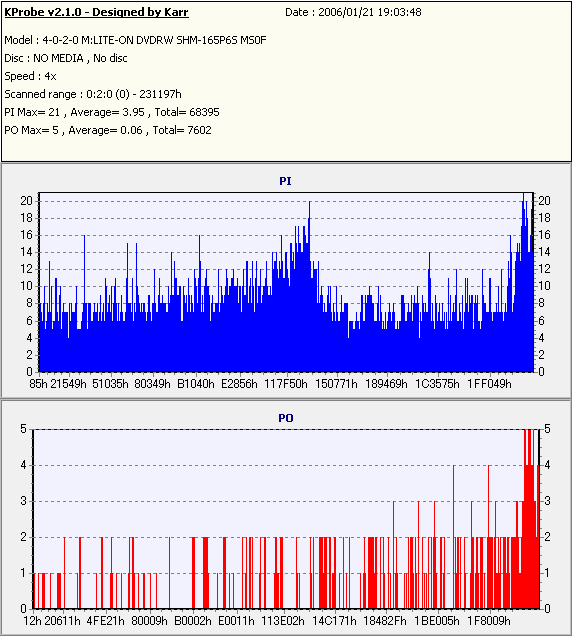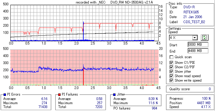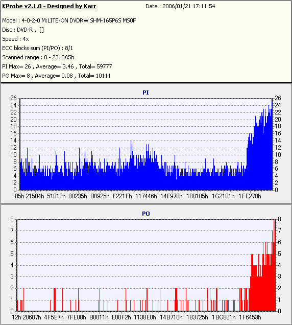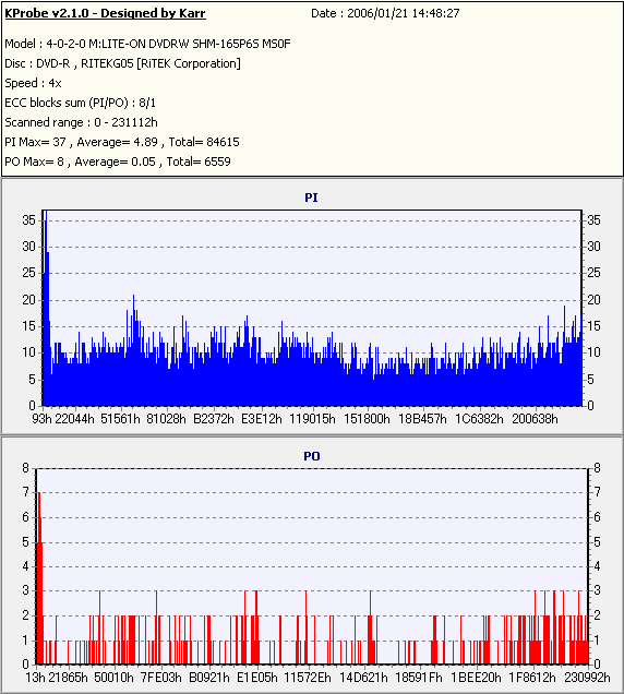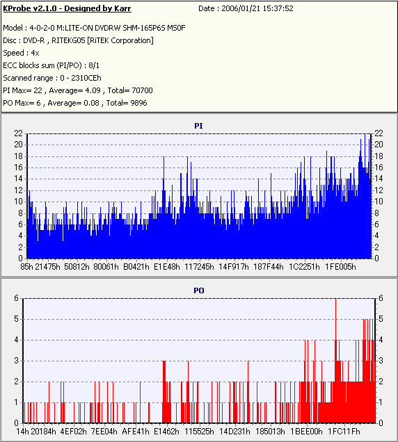 例のMasterDisc盤のあまりの酷さに、急に純正を計測したくなってしまったのが掲載の動機。 なんか全体的に外周にPIFが集まってる感じで、しかもドライブとの相性もありそうな感じではありますが、 焼いた直後はそこそこには良い感じなのが最近のRiTEK。これからゆったり劣化していくんでしょう。 |