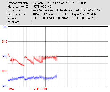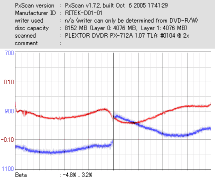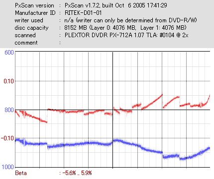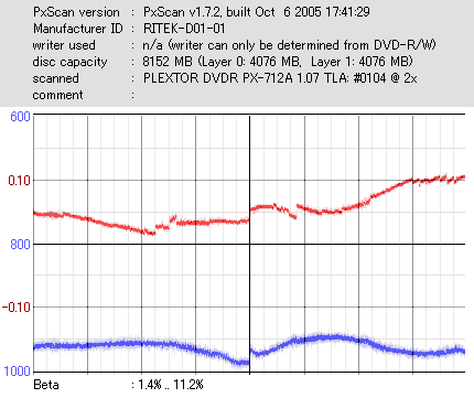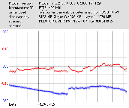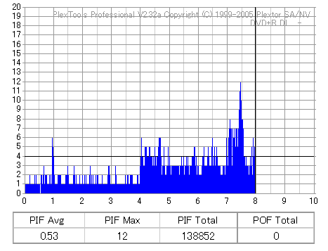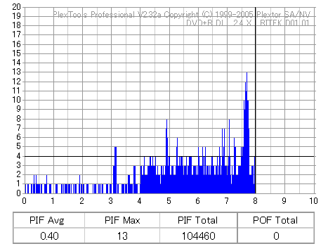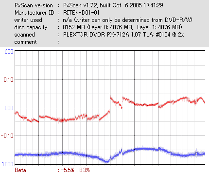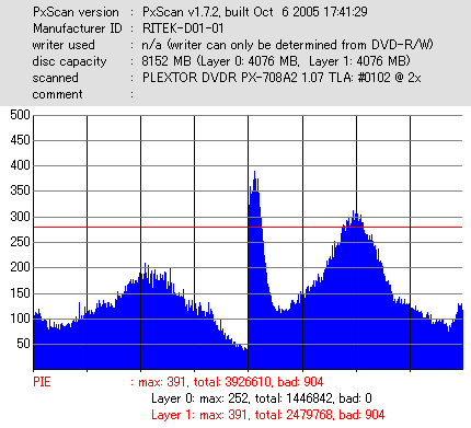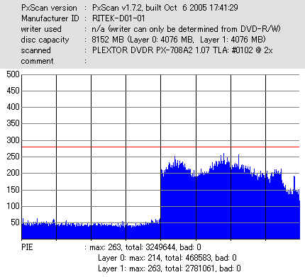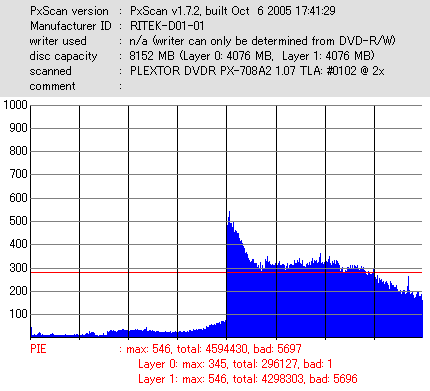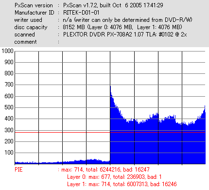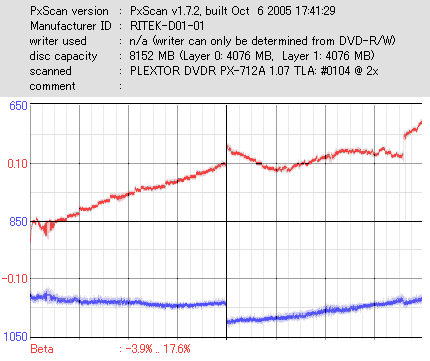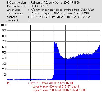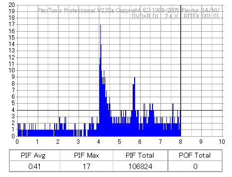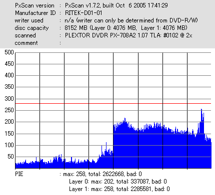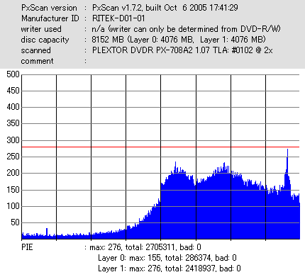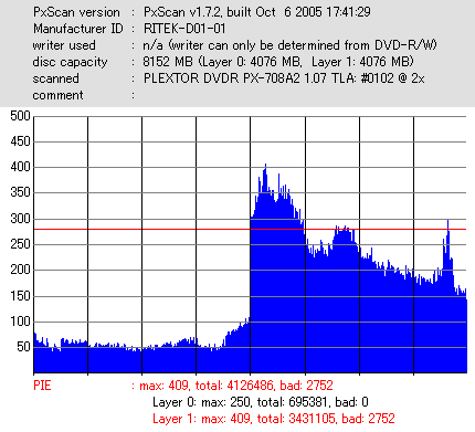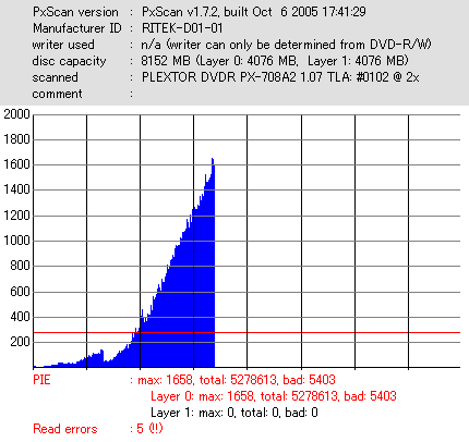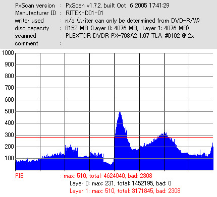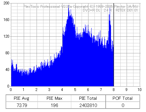 ここでは過去に検証したRiDATAブランドのものも含め、RiTEKを一括りにして色々ごちゃまぜで検証してます。 最近のRiTEKは1層目は三菱よりも良好な品質で焼けるものが多いんですが、問題は2層目。 いくつかのドライブではまあ再生には問題ないだろって程度の品質で焼けはするものの、やはりあまり印象良くないです。 ちゃんと焼けるドライブなら正直CMCやProdiscの方がまともになるんですが、ドライブの対応が今の所一番良い海外二層メディアなので やはり大量に消費する方にとっては価格の安いこのディスクのお世話になる事もあるんじゃないかと。 その場合は、できるだけ綺麗に焼けるようドライブを選んで使用することをお勧めします。 LITEONやPanasonic、pioneer等が比較的ましな結果に見えます。 ただ、管理人からはお勧めはできません。最近RICOHの色鮮録画の品質も向上してるので、せめてそっちを…… |