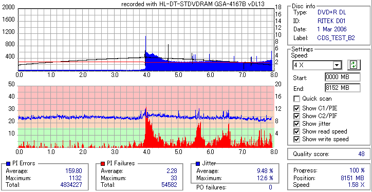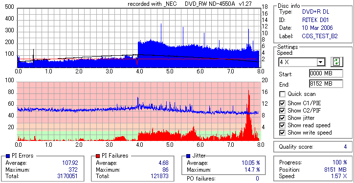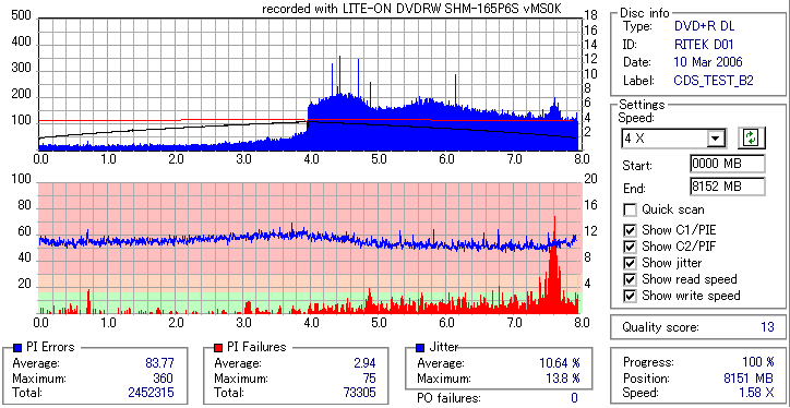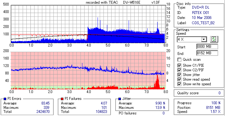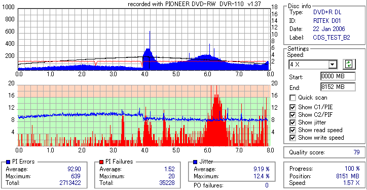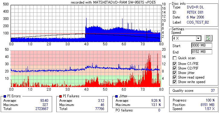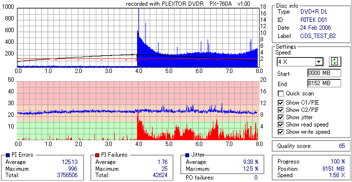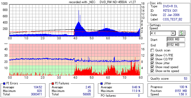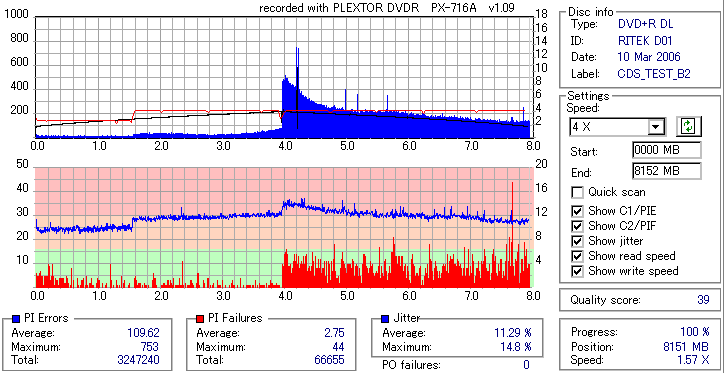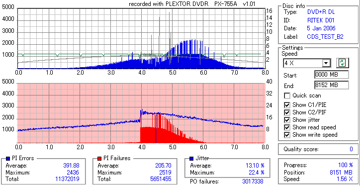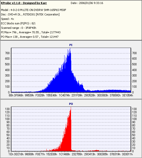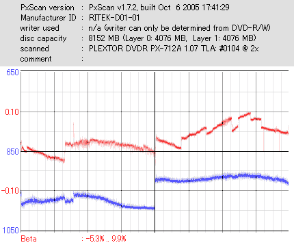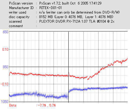 ここでは過去に検証したRiDATAブランドのものも含め、RiTEKを一括りにして色々ごちゃまぜで検証してます。 最近のRiTEKは1層目は三菱よりも良好な品質で焼けるものが多いんですが、問題は2層目。 いくつかのドライブではまあ再生には問題ないだろって程度の品質で焼けはするものの、やはりあまり印象良くないです。 ちゃんと焼けるドライブなら正直CMCやProdiscの方がまともになるんですが、ドライブの対応が今の所一番良い海外二層メディアなので やはり大量に消費する方にとっては価格の安いこのディスクのお世話になる事もあるんじゃないかと。 その場合は、できるだけ綺麗に焼けるようドライブを選んで使用することをお勧めします。 LITEONやPanasonic、pioneer等が比較的ましな結果に見えます。 ただ、管理人からはお勧めはできません。最近RICOHの色鮮録画の品質も向上してるので、せめてそっちを…… |