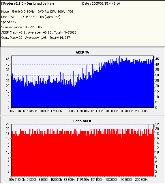 ![]() Kprobe + LITE-ON SOHC-5232Kでの1/1ECC Sum 6x CAV計測 Kprobe + SONY DRU-800Aでの8/1ECC Sum 4x CLV計測 PlexTools Professional + PLEXTOR PX-716AのPI/PO 8ECC Sum Test(速度2 クリックで詳細表示) ![]() PlexTools Professional + PLEXTOR PX-716AのTA Test(クリックで詳細情報を表示) ![]() ![]() ![]() CDSpeed + BenQ DW1620Rの品質テスト(6x CAV PIE/PIF/Jitter/POF) ![]() DVDInfoPro + Pioneer DVR-108のPI/PO Test(PIE/POE) |