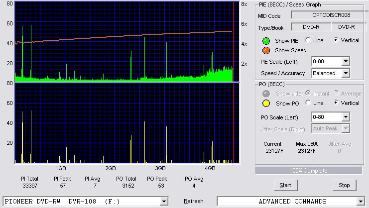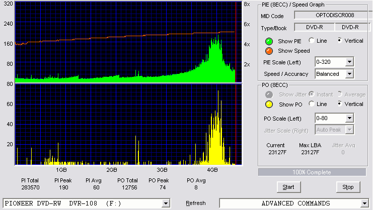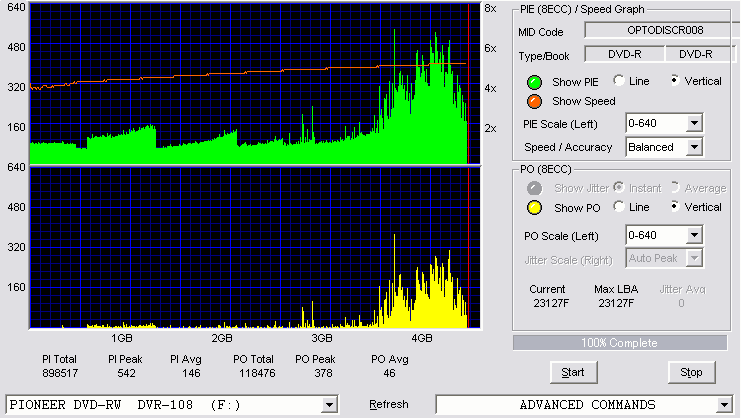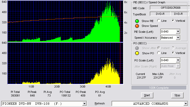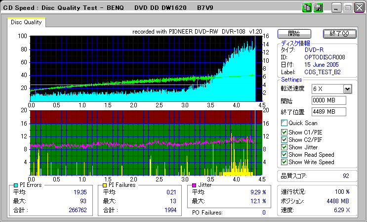 PlexTools Professional + PLEXTOR PX-716AのPI/PO 8ECC Sum Test(速度2 クリックで詳細表示) ![]() PlexTools Professional + PLEXTOR PX-716AのTA Test(クリックで詳細情報を表示) ![]() ![]() ![]() CDSpeed + BenQ DW1620Rの品質テスト(6x CAV PIE/PIF/Jitter/POF) ![]() DVDInfoPro + Pioneer DVR-108のPI/PO Test(PIE/POE) |