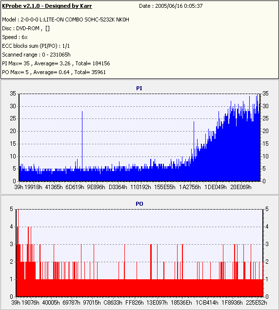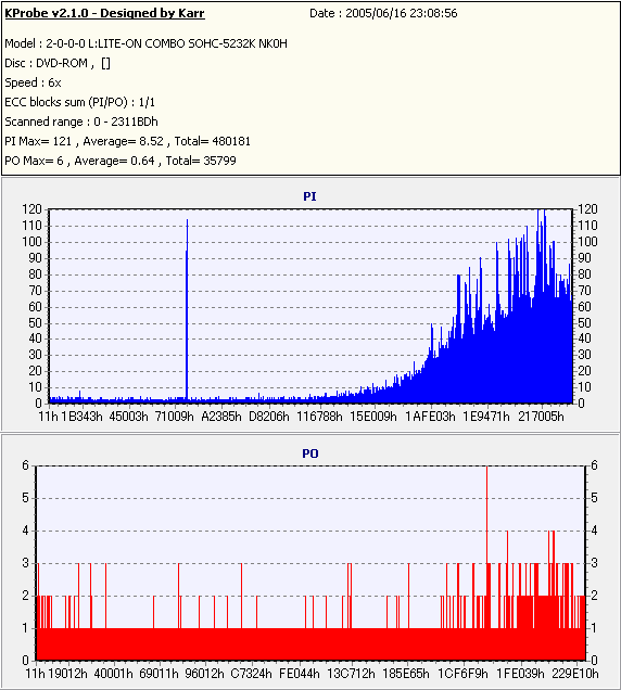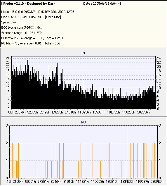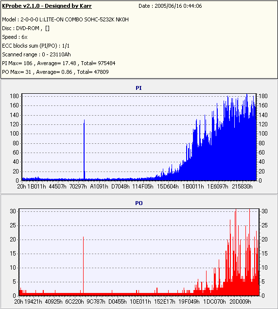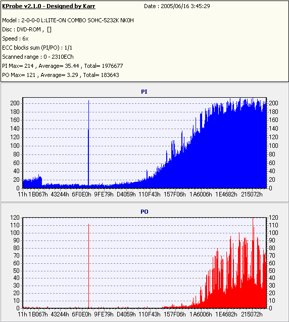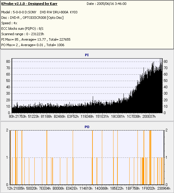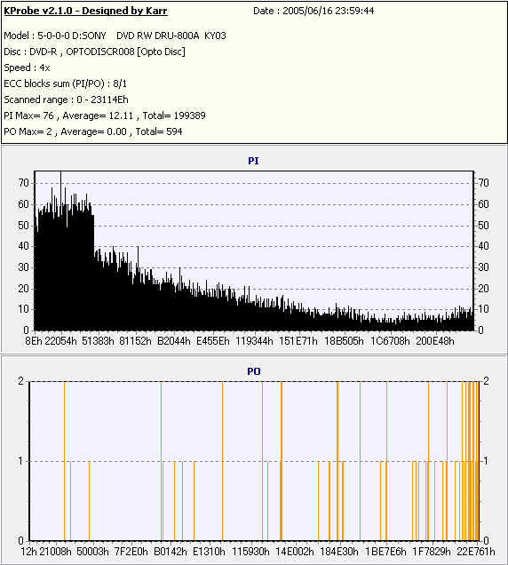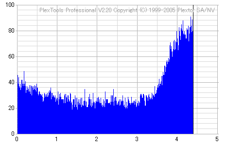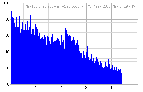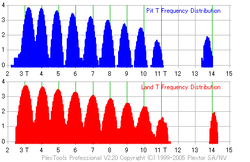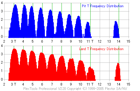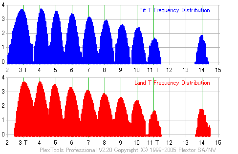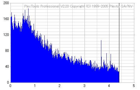 某バグにより画像損失。(頼むからもういい加減修正してください…) Kprobe + LITE-ON SOHC-5232Kでの1/1ECC Sum 6x CAV計測 Kprobe + SONY DRU-800Aでの8/1ECC Sum 4x CLV計測 PlexTools Professional + PLEXTOR PX-716AのPI/PO 8ECC Sum Test(速度2 クリックで詳細表示) ![]() PlexTools Professional + PLEXTOR PX-716AのTA Test(クリックで詳細情報を表示) ![]() ![]() ![]() CDSpeed + BenQ DW1620Rの品質テスト(6x CAV PIE/PIF/Jitter/POF) ![]() DVDInfoPro + Pioneer DVR-108のPI/PO Test(PIE/POE) |