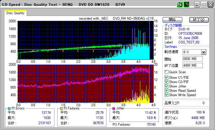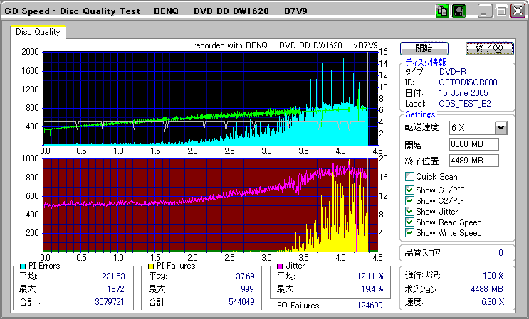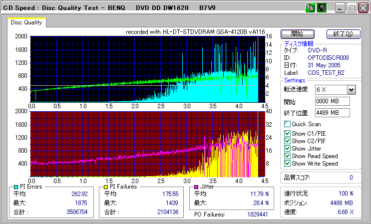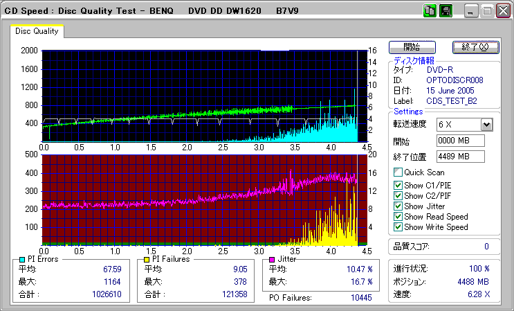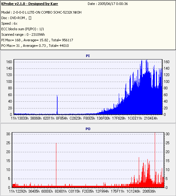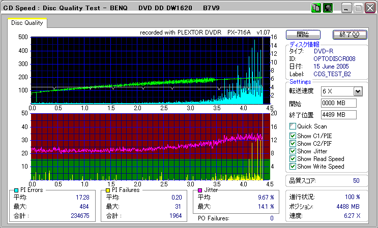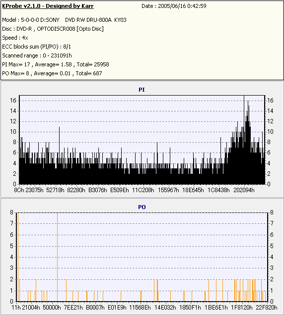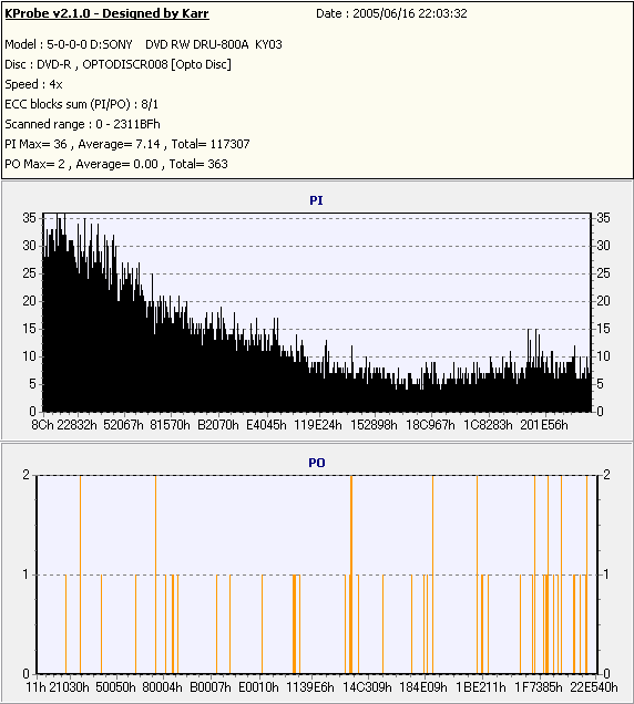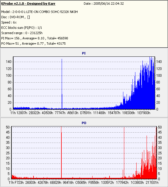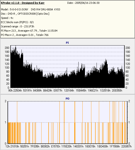 某バグにより画像損失。(頼むからもういい加減修正してください…) Kprobe + LITE-ON SOHC-5232Kでの1/1ECC Sum 6x CAV計測 Kprobe + SONY DRU-800Aでの8/1ECC Sum 4x CLV計測 PlexTools Professional + PLEXTOR PX-716AのPI/PO 8ECC Sum Test(速度2 クリックで詳細表示) ![]() PlexTools Professional + PLEXTOR PX-716AのTA Test(クリックで詳細情報を表示) ![]() ![]() ![]() CDSpeed + BenQ DW1620Rの品質テスト(6x CAV PIE/PIF/Jitter/POF) ![]() DVDInfoPro + Pioneer DVR-108のPI/PO Test(PIE/POE) |