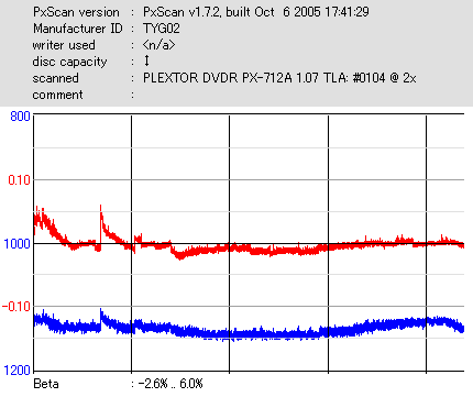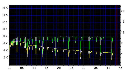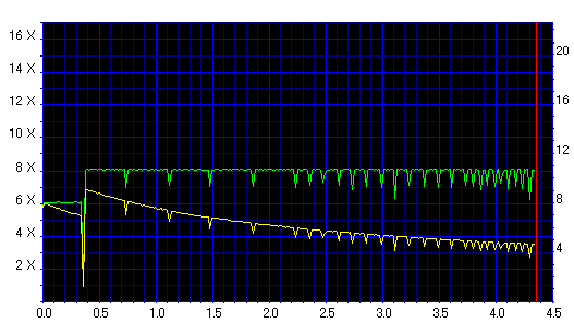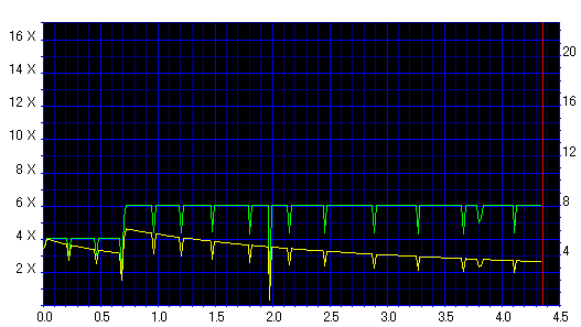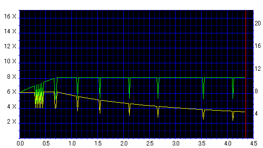 Jitterのブレが大きく、速度も8x指定にしたにも拘らず6x止まりとなりました。このドライブとは相性悪そうです。 |