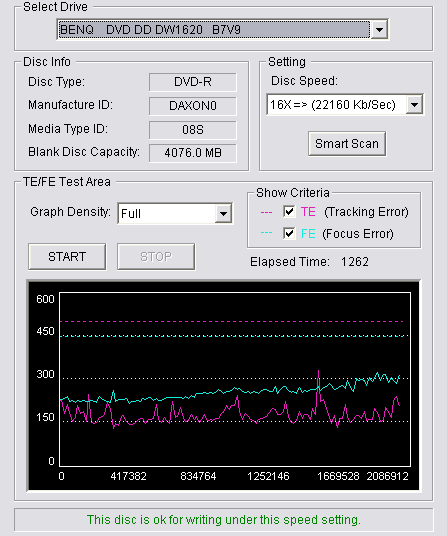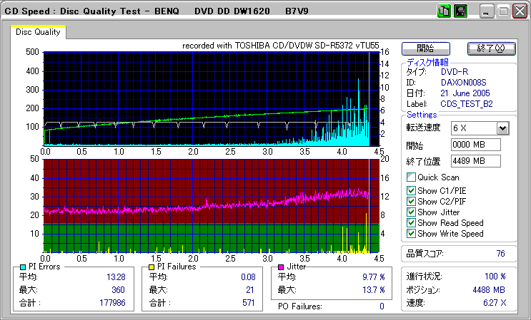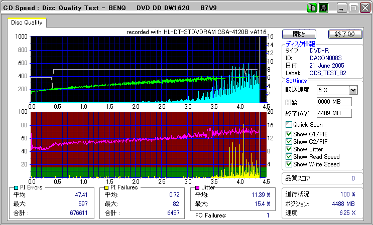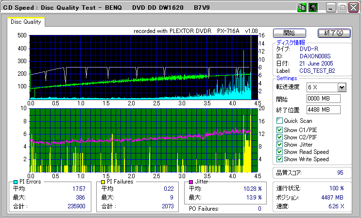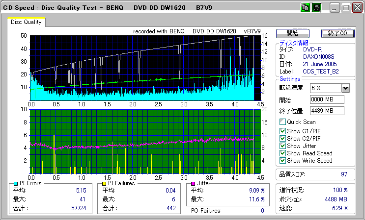 CDSpeed + BenQ DW1620Rの品質テスト(6x CAV PIE/PIF/Jitter/POF)