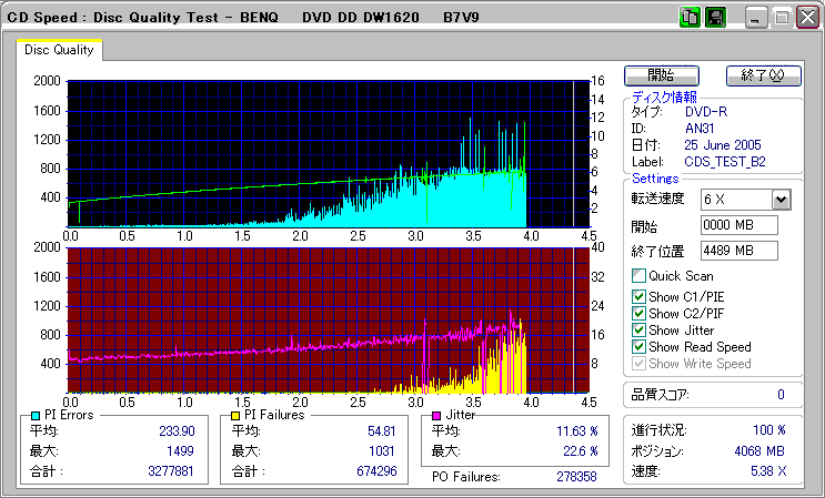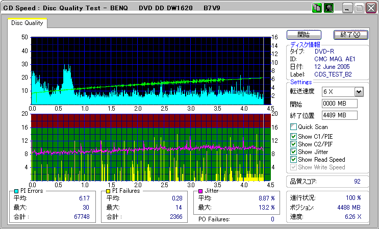 CDSpeed + BenQ DW1620Rの品質テスト(6x CAV PIE/PIF/Jitter/POF)