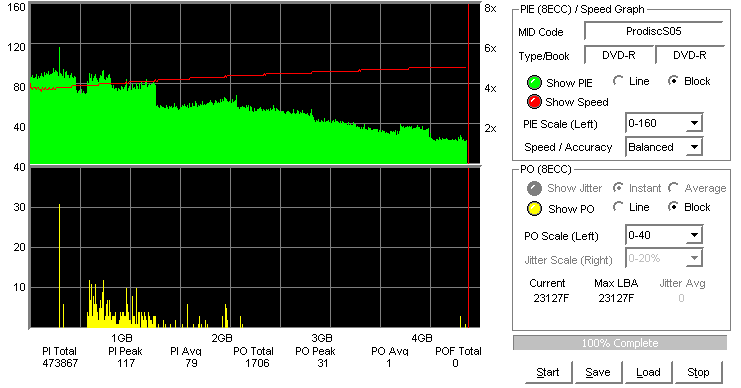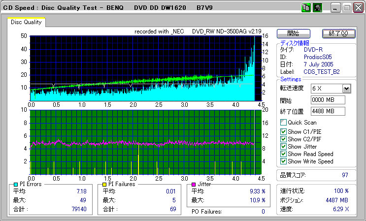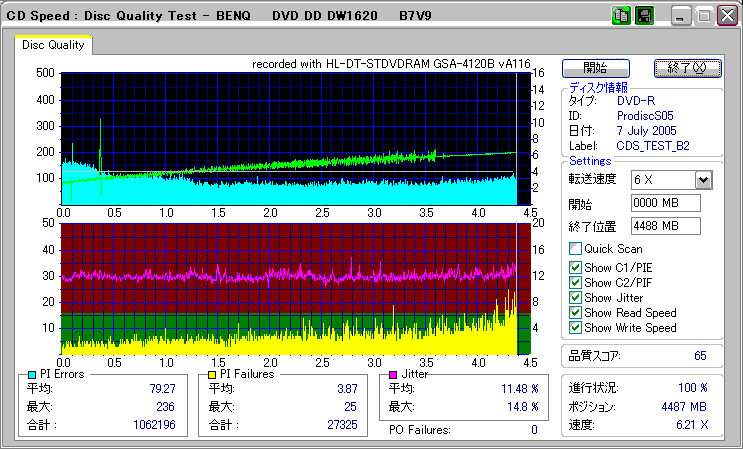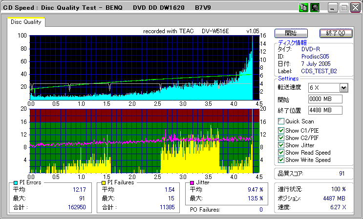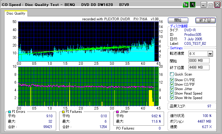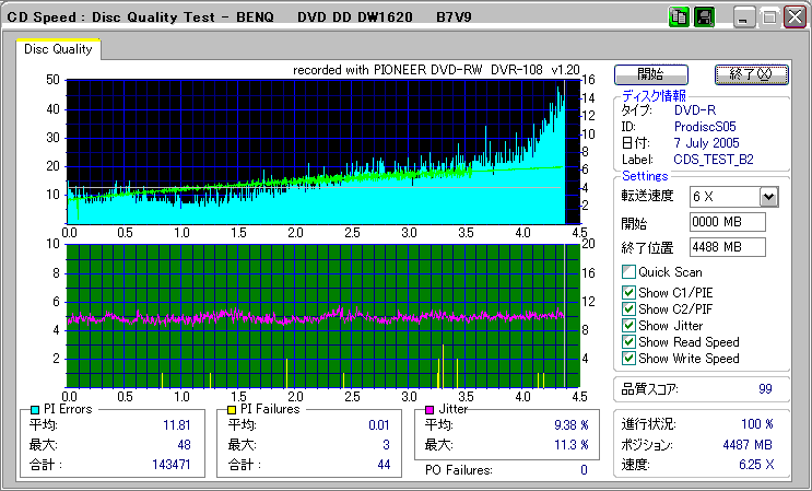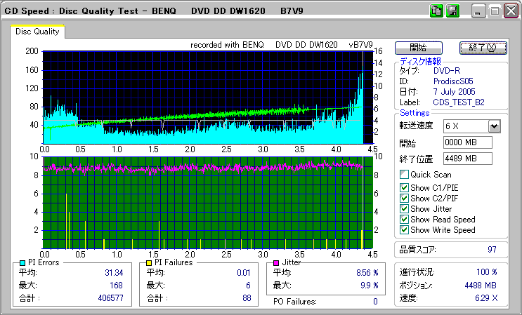 CDSpeed + BenQ DW1620Rの品質テスト(6x CAV PIE/PIF/Jitter/POF) |