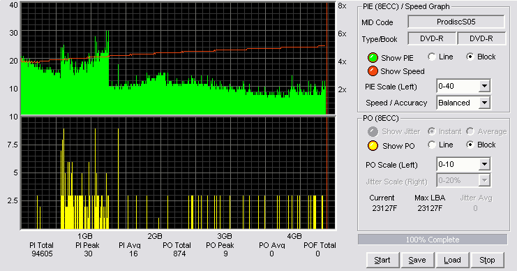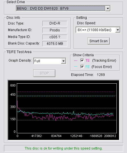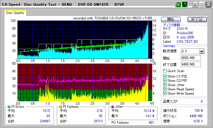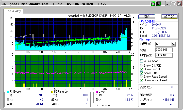 CDSpeed + BenQ DW1620Rの品質テスト(6x CAV PIE/PIF/Jitter/POF) |
