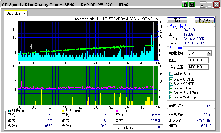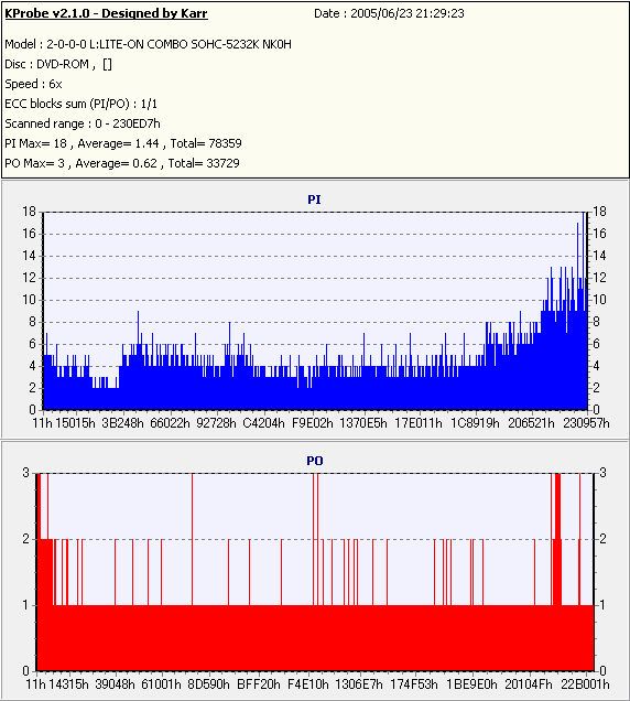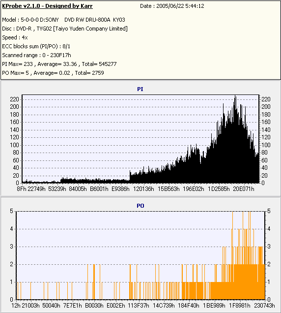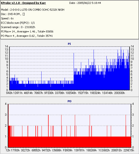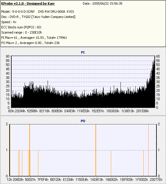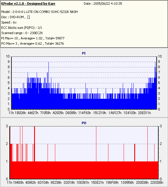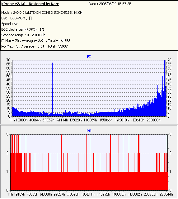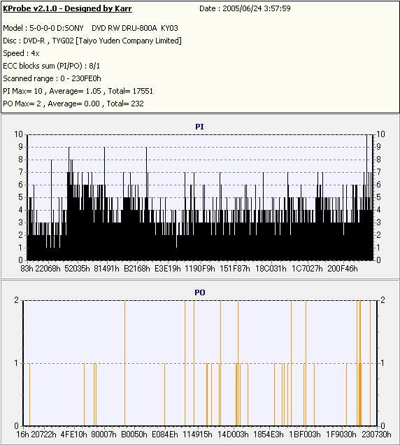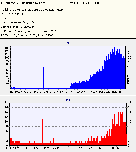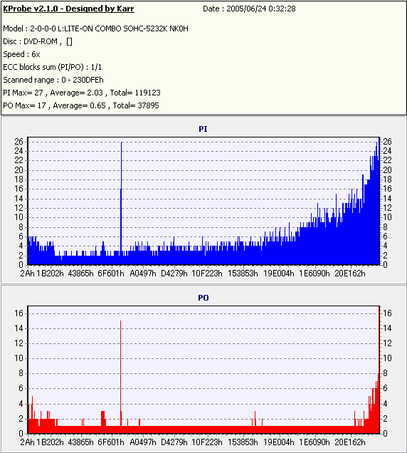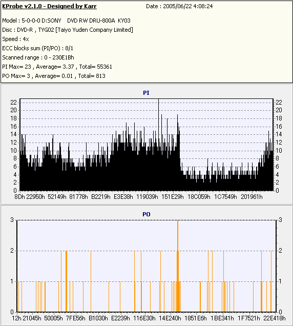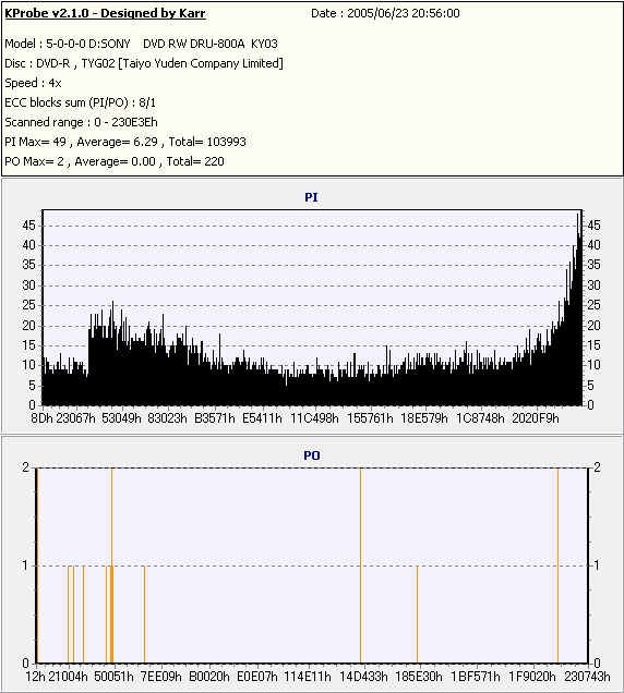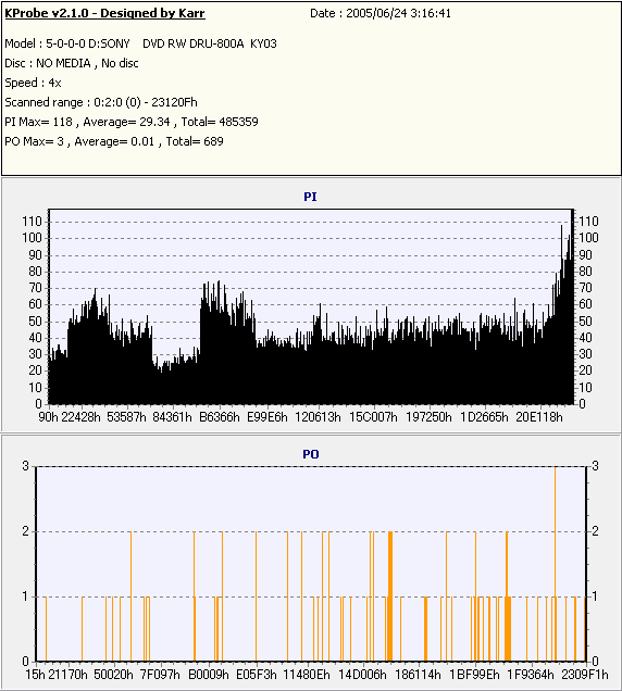 ![]() Kprobe + LITE-ON SOHC-5232Kでの1/1ECC Sum 6x CAV計測 Kprobe + SONY DRU-800Aでの8/1ECC Sum 4x CLV計測 PlexTools Professional + PLEXTOR PX-716AのPI/PO 8ECC Sum Test(速度2 クリックで詳細表示) ![]() PlexTools Professional + PLEXTOR PX-716AのTA Test(クリックで詳細情報を表示) ![]() ![]() ![]() CDSpeed + BenQ DW1620Rの品質テスト(6x CAV PIE/PIF/Jitter/POF) ![]() DVDInfoPro + Pioneer DVR-108のPI/PO Test(PIE/POE) |