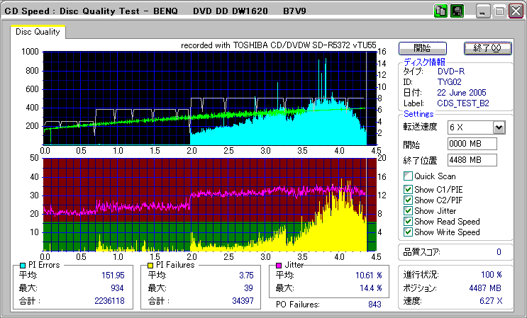 ![]() PlexTools Professional + PLEXTOR PX-716AのTA Test(クリックで詳細情報を表示) ![]() ![]() ![]() CDSpeed + BenQ DW1620Rの品質テスト(6x CAV PIE/PIF/Jitter/POF) マウントできない DVDInfoPro + Pioneer DVR-108のPI/PO Test(PIE/POE) |
