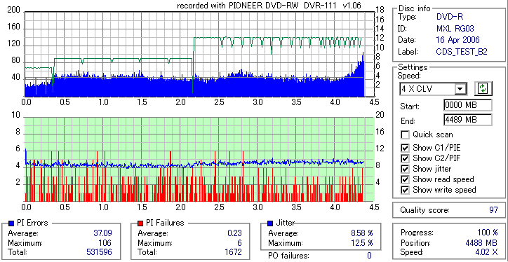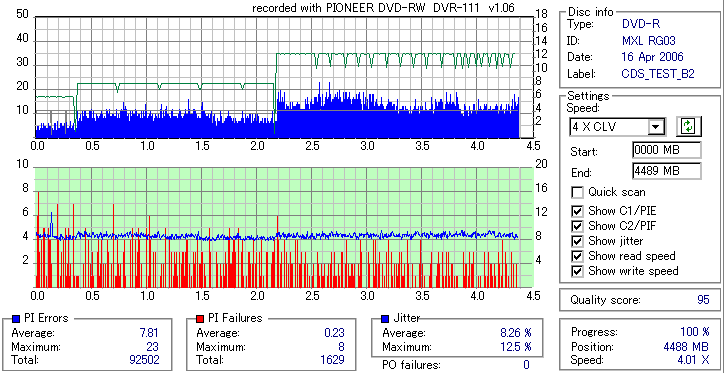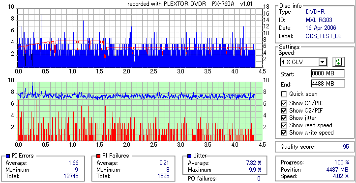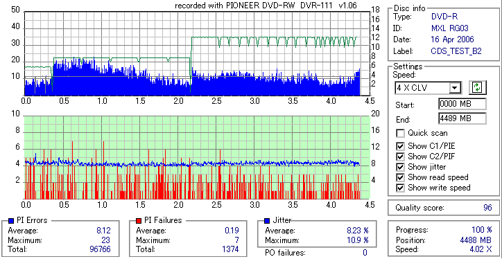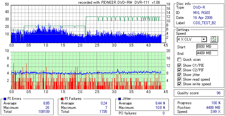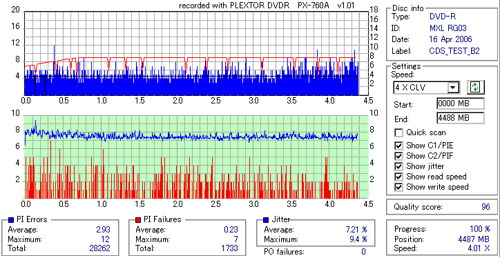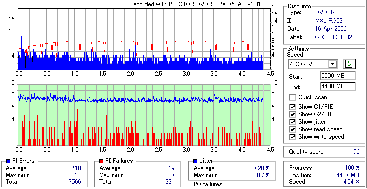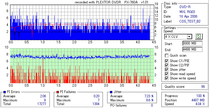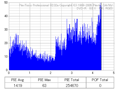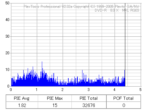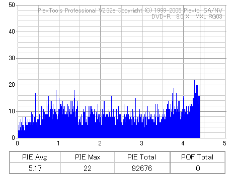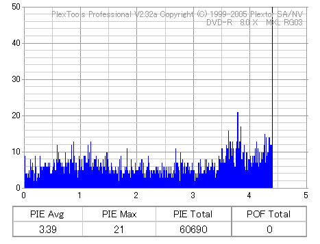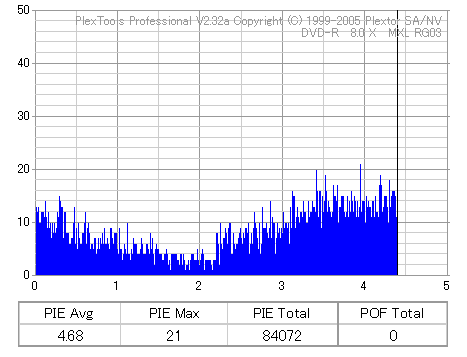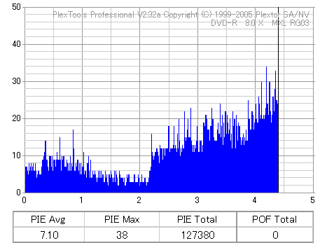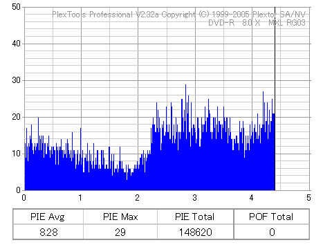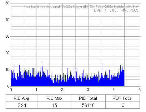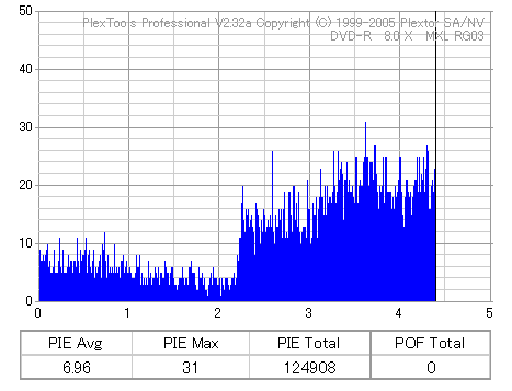 考察:上のPIE TOTALの結果を見てもらえると判る通り、ピンク色のディスクの結果が他と比べてかなりエラーが多めに出ています。 ただ、PX-760Aでのmaxell8倍への書き込みはかなり安定しているようで、特に使用に問題のありそうな結果はありませんでした。 maxell8倍といえば、昔は個体差の大きいディスクとして避けられがちだったんですが……最近はそうでもないのかもしれません。 |