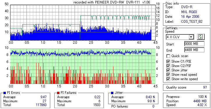 考察:こちらはPioneer DVR-111の結果です。個体差がわかりやすいようにと、敢えて速度違反での書き込みを行ってみました。 見てもらえれば判るかと思うんですが、オレンジ色のディスクのエラー値が一つ異彩を放っています。 一つだけ他の5倍以上のエラー値を叩き出してますからね……やっぱり個体差は存在するんだってことでしょうか。 |