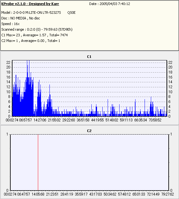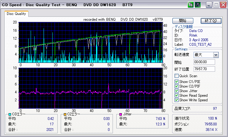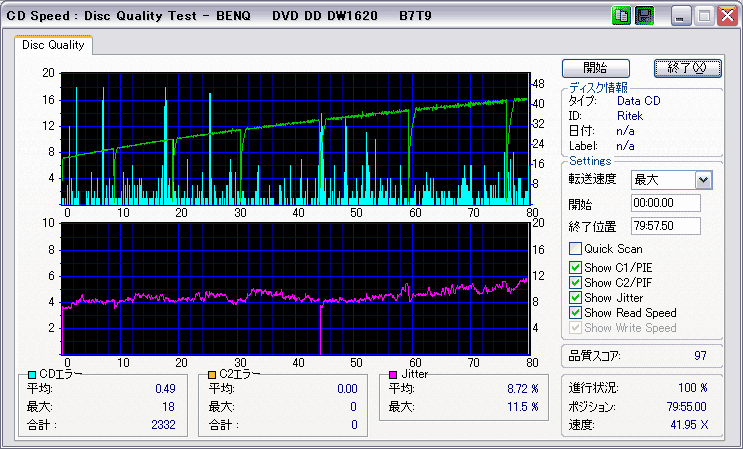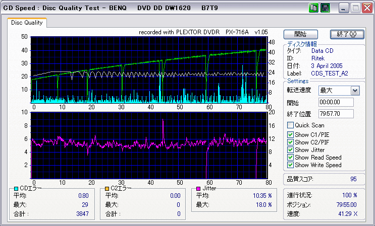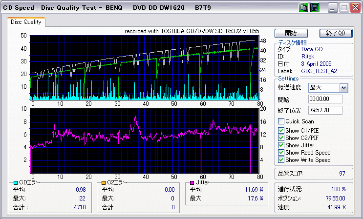 32x→40x切り替え地点でJitterが上昇しており、外周で1本C2エラーが発生してしまっているのも気になるので、