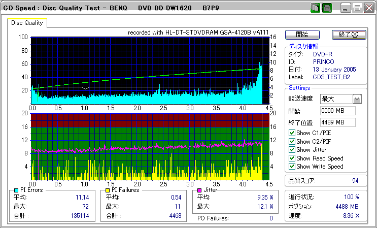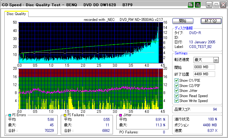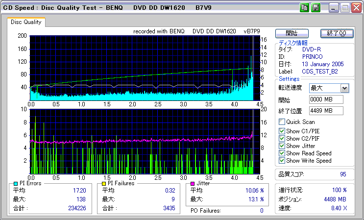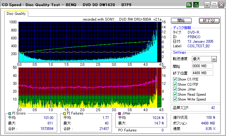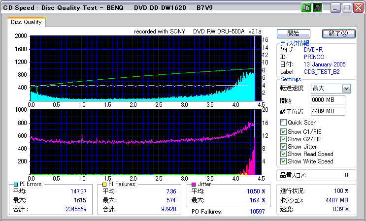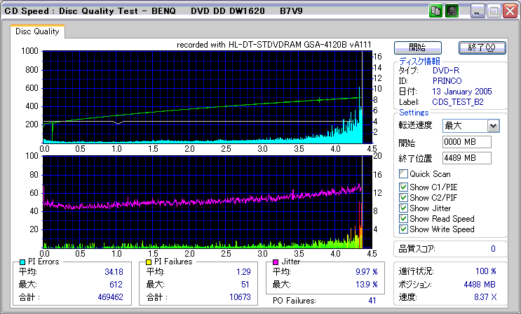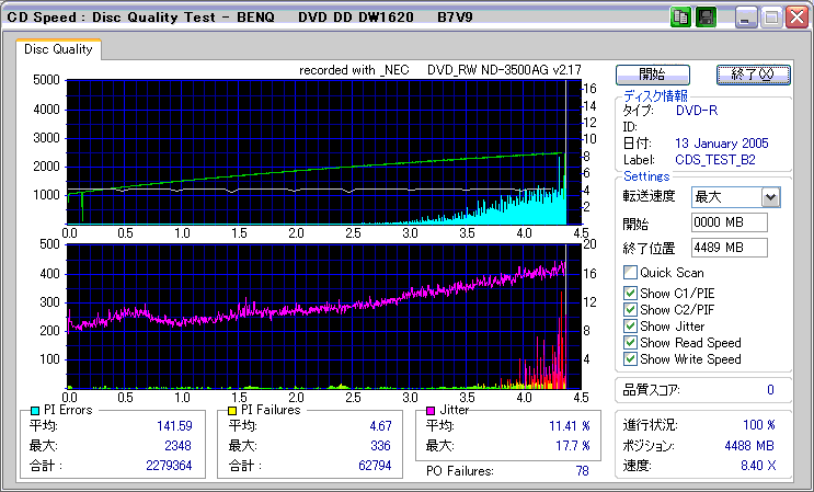 2005.1.13⇒2005.7.31の劣化具合総評。 web上で『消える』と口頭で囁かれているメディアはいくつかありますが、このメディアに関しては 非常に残念な事に、本当に消えるみたいです。 特に外周だけでなく内周からもエラーが広がっていくという点がやっかいでして、 例え容量を抑えて焼いても、内周が死ぬとメディア自体を認識できなくなります。 焼いたドライブによって(多分レーザーの照射具合に左右されるんでしょうけれど)差は出ていますが、 安全に使いたければ、このメディアは半年が寿命と思った方が良いかもしれません。 |