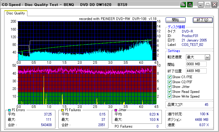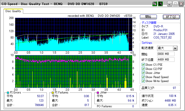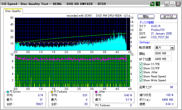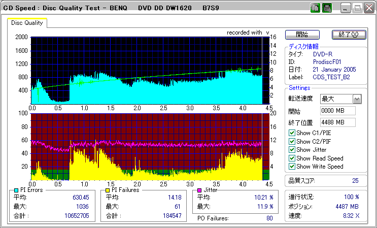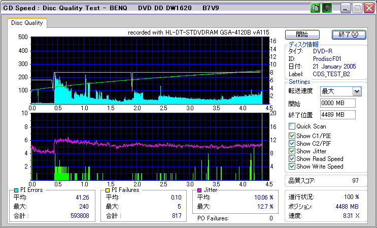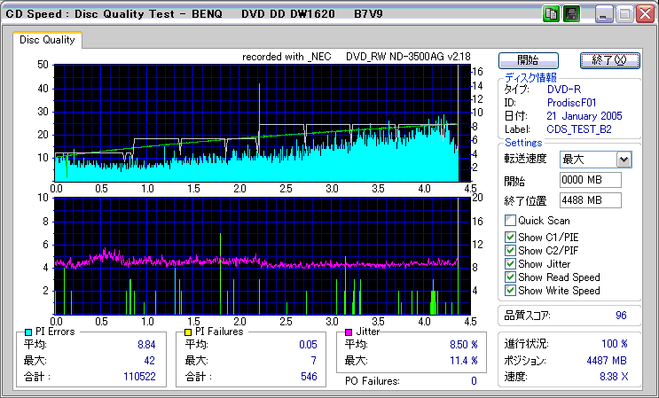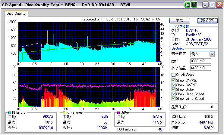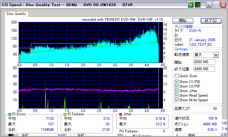 2005.1.21⇒2005.8.8の劣化具合総評。 グラフの形状を綺麗に保ったままで、平均分布的にPIEが増加している結果が目立ちました。 これはメディアの造り云々の問題でなくて、多分色素自体が劣化しやすい材質なんじゃないかという疑惑が…… 今の所増えてるのはPIEだけですから、そうすぐにどうこうという事は無いんでしょうけれど、 これから更に劣化が進んでPIFなんかも増えてくるのだとしたら、それは問題でしょうね。 |