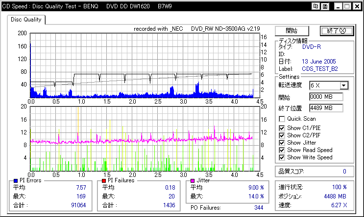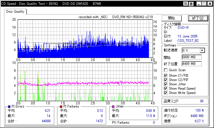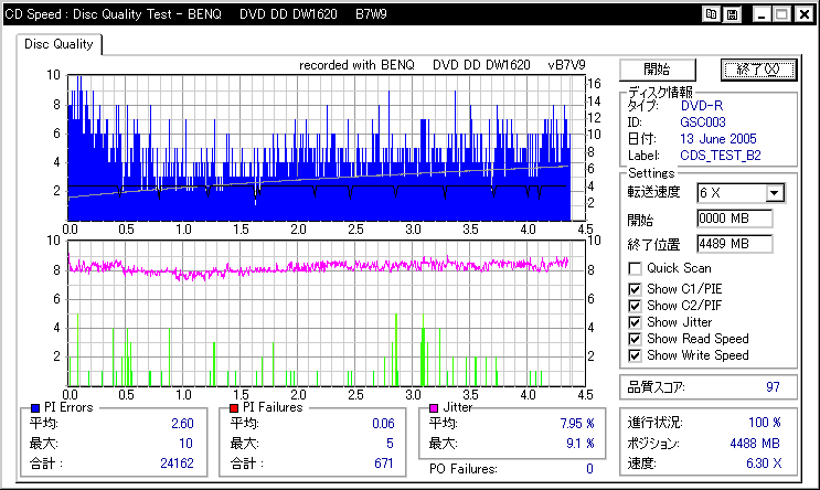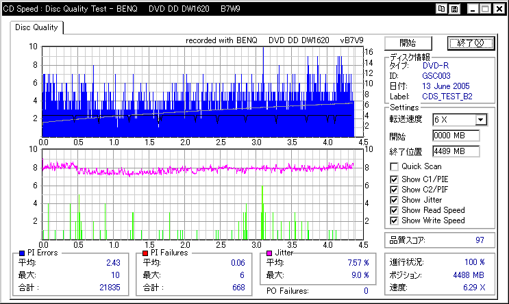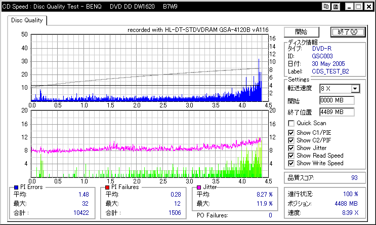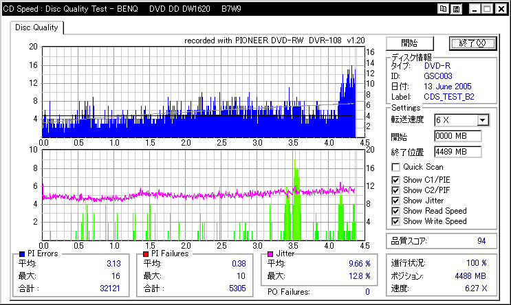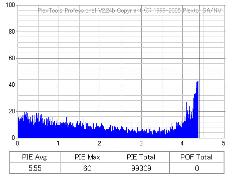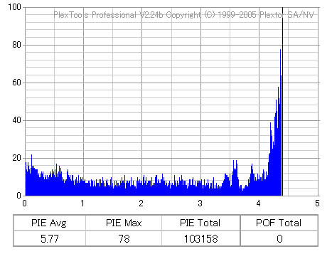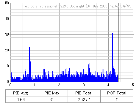 ![]() これはB100が糞だったってことで。 ちなみに焼きドライブの表示が3500Aになってますが、 グラフを見れば分かる通り、9585で焼いたものに相違ありません。 ディスク抜いてグラフが消える前に入れ替えるとたまにあるんですよね、こういうこと。 |