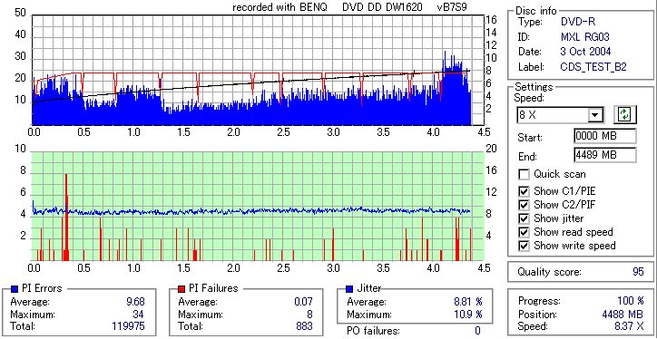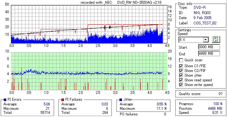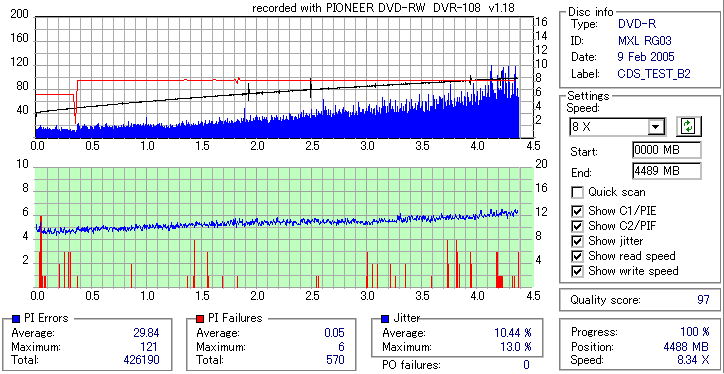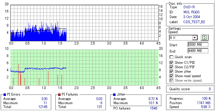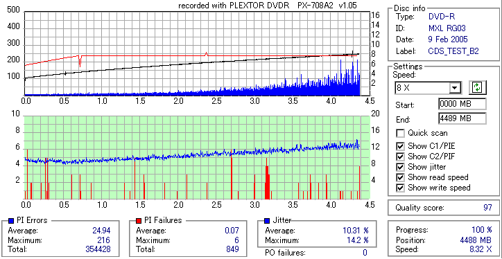 全体を通して大きく劣化してるとかではないんですが、焼いたドライブによってはどうも外周が少し劣化しているものが見受けられます。 管理人もmaxellなら大丈夫だろうと思っていたのですが…ドライブ次第では8倍はあんまり信用ならんのかもしれません。 |