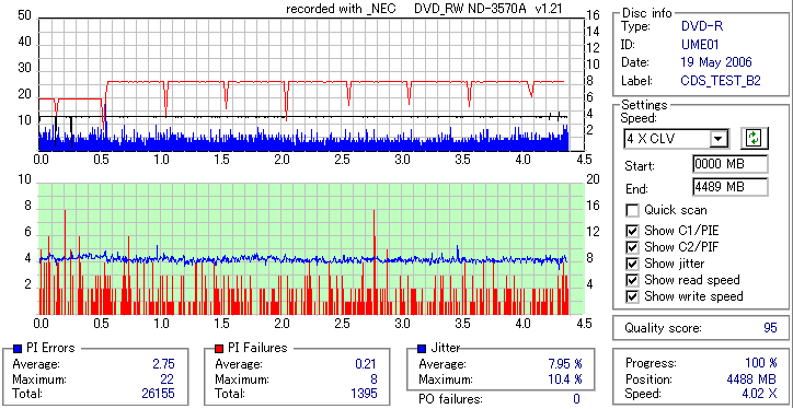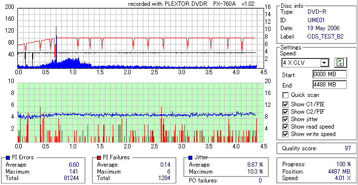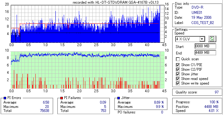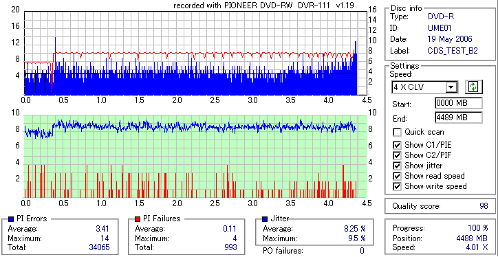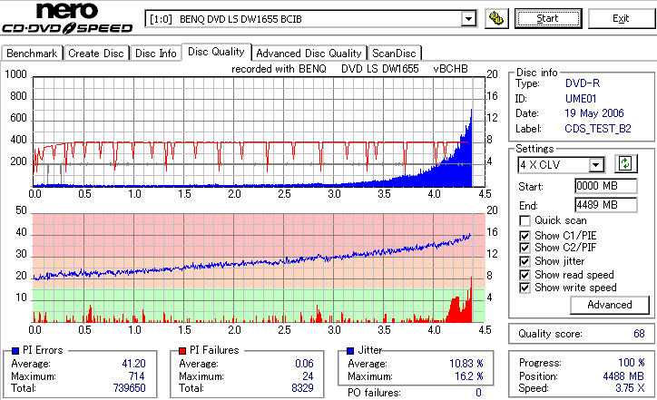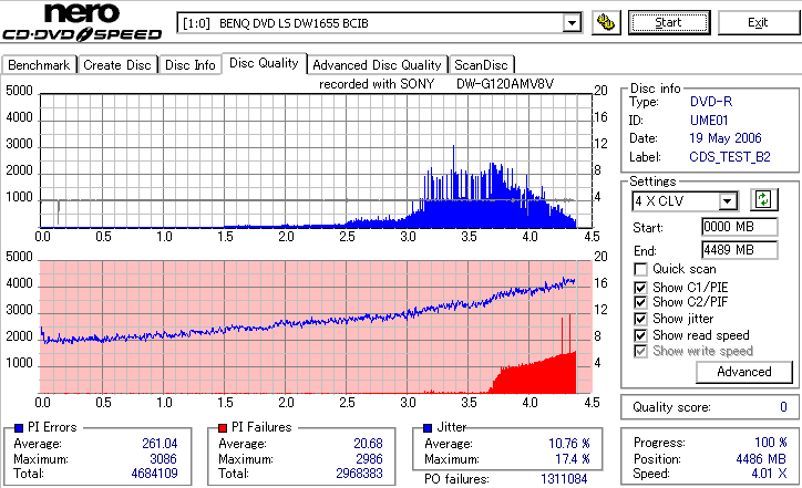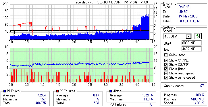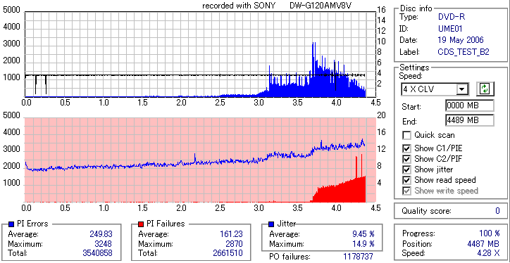 焼いてから10か月、当時選別品と見られていたeMARKブランドですが、外周のJitter上昇が大きく 劣化がないと考えるのは難しい結果となってしまいました。 Umedisc系8倍はRiTEK並みに気をつけた方が良いかもしれないですね。 |