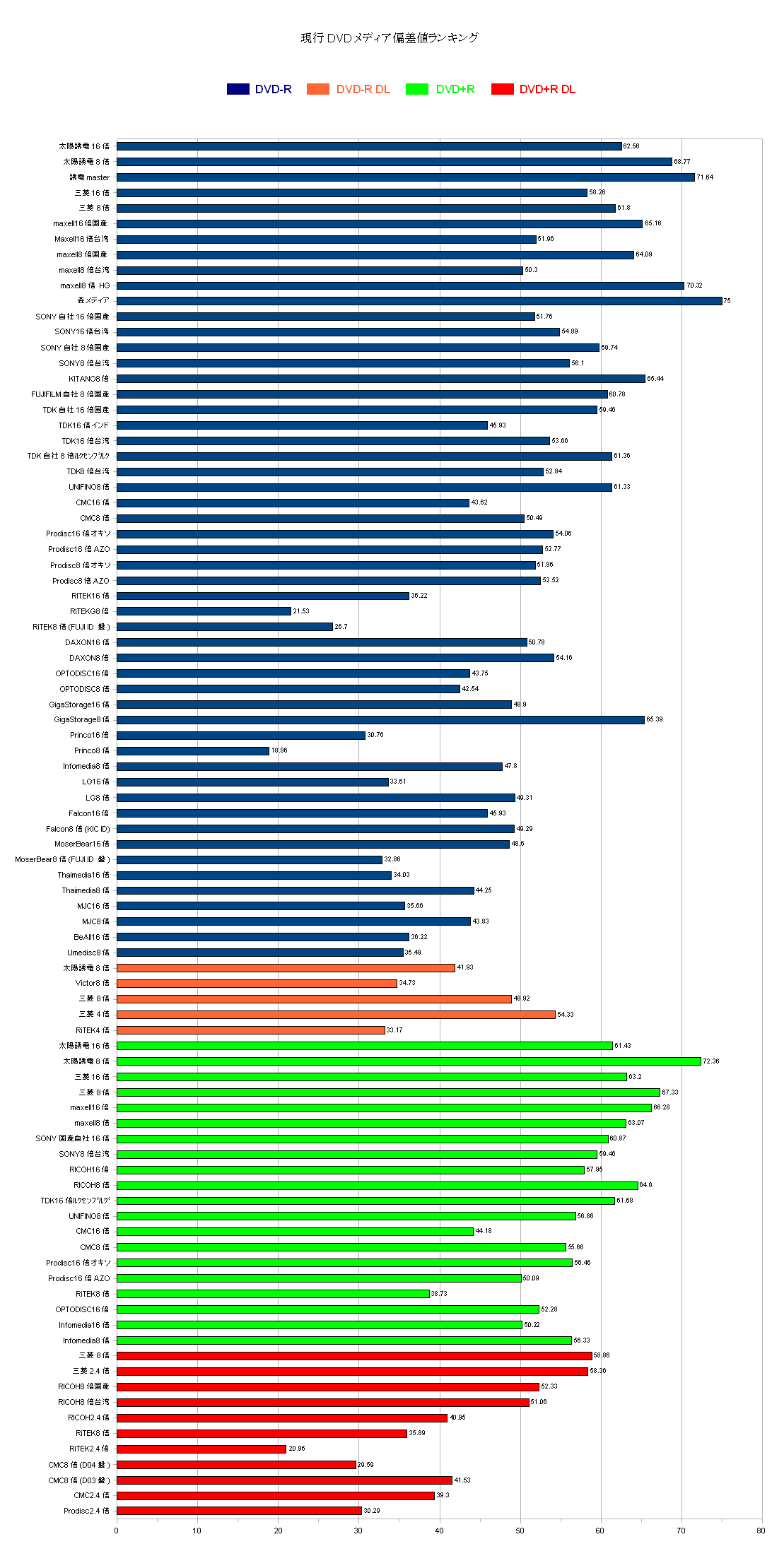 さすがというか何というか、今も昔も変わらない。台湾の笑えるメディア、Princoが堂々の首位を飾りました。ある意味予想はできていましたが、本当に首位を取ってしまいましたね・・・ さあ、首位は放っといて他のメディアに参りましょう。2位以下を見てみると、2,3,4位、そして9位、15位とRiTEK社製のメディアがかなりの数を占めています。データ自動消去機能によって一気に悪名を広めてしまい、もう世界各国の嫌われ者ですねこのメディアは。 全体の傾向としては、やはり品質の安定しない海外系DLディスクや、まだ技術力の安定しないマイナーメーカーの16倍ディスクなどがランク下位を軒並み独占してしまっている形です。これはある意味DVD規格がこういう方向に進んでしまったせいでもあると言えるので、MJCとかThaimediaとか低倍速ディスクの評価が高かったメーカーなんかは特に気の毒な結果となっています。 ただ、その中で異質なのが第11位のVictor。こいつ国内メーカーで、しかも国内工場で国産としてメディア製造してるくせに、一体こんな所で何をやってるんでしょうね。ドライブ側の対応が悪いと言ってしまえばそれまでなんですが、その状況が今に至るまでいつまで経っても改善されないのが非常に問題になってます。Victor側も4倍速メディアとして販売するなどの対策(というより、苦肉の策?)を取ってはいるみたいなんですが、同時に売り上げを伸ばしたいからなんでしょうけれども、『全てのレコーダーに対応!』とかまるで余計な事までアピールをしてしまっており、そして実態はそうではないわけですから効果は全くと言っていいほど出ていないですね。価格.com辺りのクチコミ情報とかを見ていただければこいつを買ってしまった悲しみの声が溢れかえってます。 他のメディアを含めた全ランキングはこちら。 ![]() ランキング作成にあたっては、のべ66名の方にご投票いただき、ランキングの作成にご協力頂きました。 ご協力くださったメディア好きの皆様、どうも有難うございました。 |