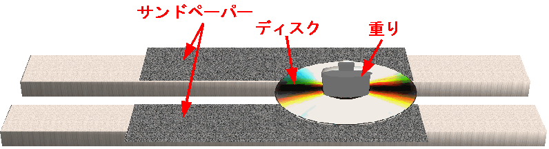 ・重り 三晃物産株式会社製 園芸用受皿A-4 + 適当な重りになるもの ・サンドペーパー 三共理化学 FUJI STARシリーズ 耐水研磨紙 DCCS(made in Japan) http://www.sankyorikagaku.co.jp/product/polishing/seat.html#001 粒度#2000 ・各社DVD-Rディスク [1]. TDK DVD-R 超硬 8x(ルクセンブルク製) [2]. TDK DVD-R 超硬 16x(誘電OEM 日本製) [3]. SONY "音匠" DVD-R 16x(日本製・自社) [4]. maxell HG DVD-R 8x(日本製・自社) [5]. 三菱化学メディア UltraLife GOLD DVD-R 8x(特殊レイヤー素材Prodisc委託) [7]. Imation "ForceField" DVD-R 8x(ディスク:台湾 / 組立:米国) [9]. UNIFINO スーパーストロング DVD-R 8x [10]. 森メディア DVD-R PRO.MASTER [11]. 太陽誘電 That's DVD-R 16x(非ハードコート) [12]. GigaStorage DVD-R 8x(非ハードコート) [13].RICOH DVD+R 16x(非ハードコート) ![]() 三晃物産株式会社製 園芸用受皿A-4 ![]() 園芸用受皿と適当なおもり |