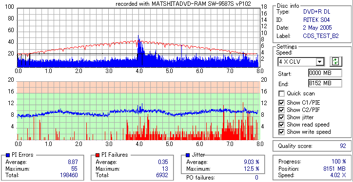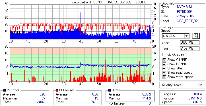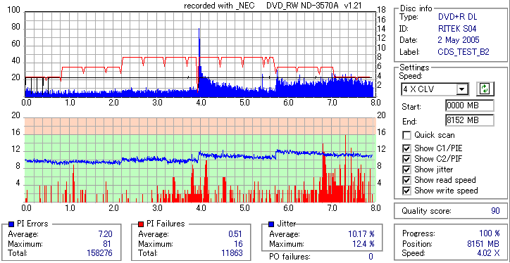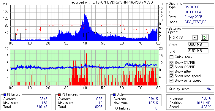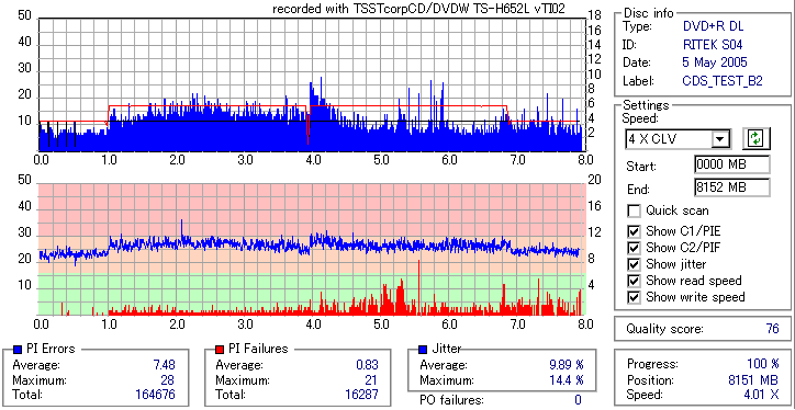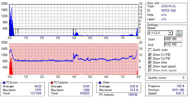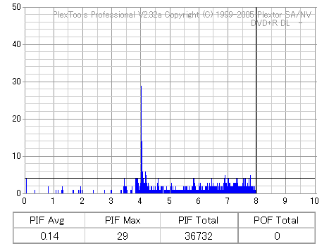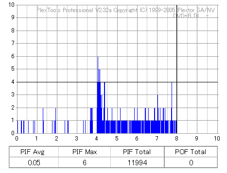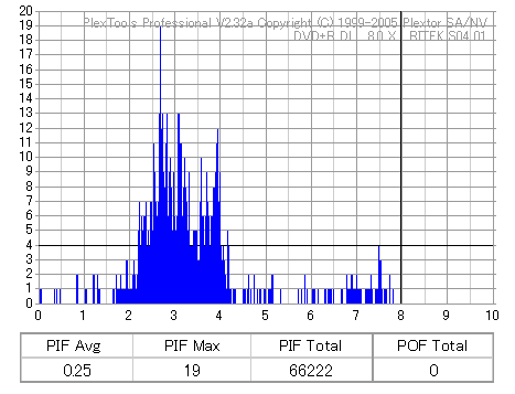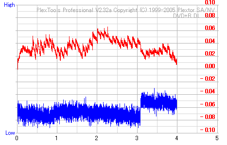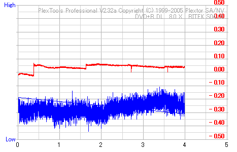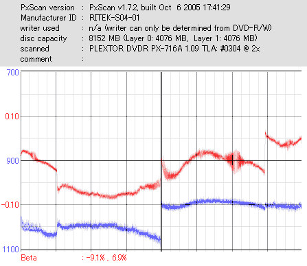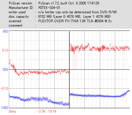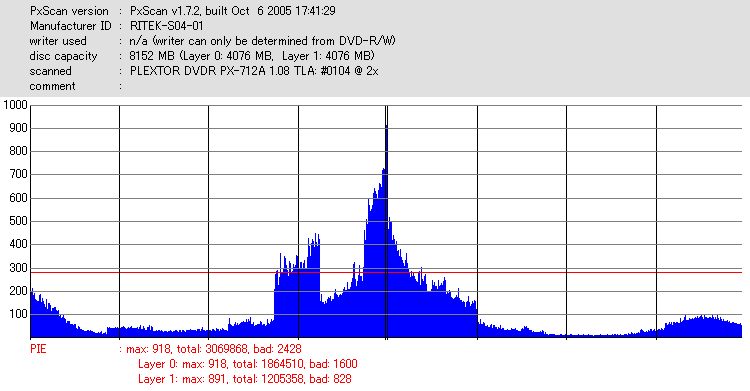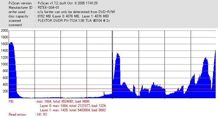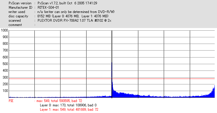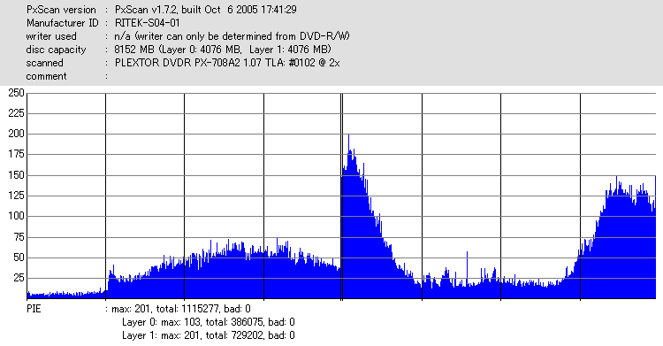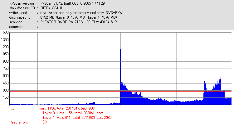 RiTEKの2層っていうと国内では駄目なイメージが強く、当サイトの検証でも散々な結果ばかり残していますのであんまり期待してる人も多くないと思いますが、今回はRiTEKもがんばったようで。決して良い結果ではないんですが、2層目がかなりまともになっています。正式に2層対応していないPX-712系ドライブでの結果は全体的に悪いですが、BenQ系ドライブでの計測結果はかなりまともなので、一般的にはそこそこ評価も上がってくるんじゃないでしょうか。